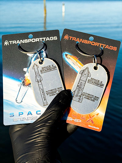 FYI... TransportTags is a mother and son business that makes key tags and memorabilia from historic transportation pieces that they save from being scrapped. TransportTags' SpaceX Starship tag is... ...a fragment from SN11, an upper-stage prototype tested at Boca Chica, Texas. On March 30, 2021, SN11 ascended and descended successfully but met an explosive end just before touchdown. Salvaged from the waters near the site, this stainless steel section was acquired in 2025 from YouTuber and influencer Jack Schneider. In 2026, we upcycled these reclaimed pieces into unique TransportTags, each embedding a tangible slice of Starship’s developmental journey... (Please note that Transport Tags LLC is NOT an authorized or licensed distributor of SpaceX or NASA, and uses their name, markings, etc., for identification purposes ONLY in accordance with the Lanham Act.)  | |