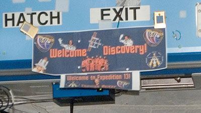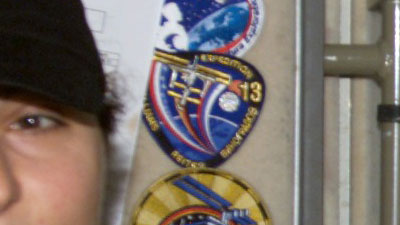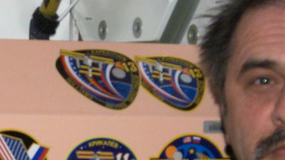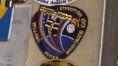 The Expedition 13 crew have added their insignia to the collection of mission decals aboard the ISS. Interestingly the Expedition 13 crew have added two decals to the collection — one with two flags and two names and a second with three flags and three names. The two flags and three name insignia is nowhere to be seen! The ISS mission insignia can be viewed in the following NASA photo:  |