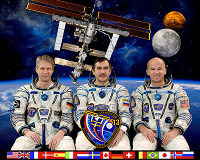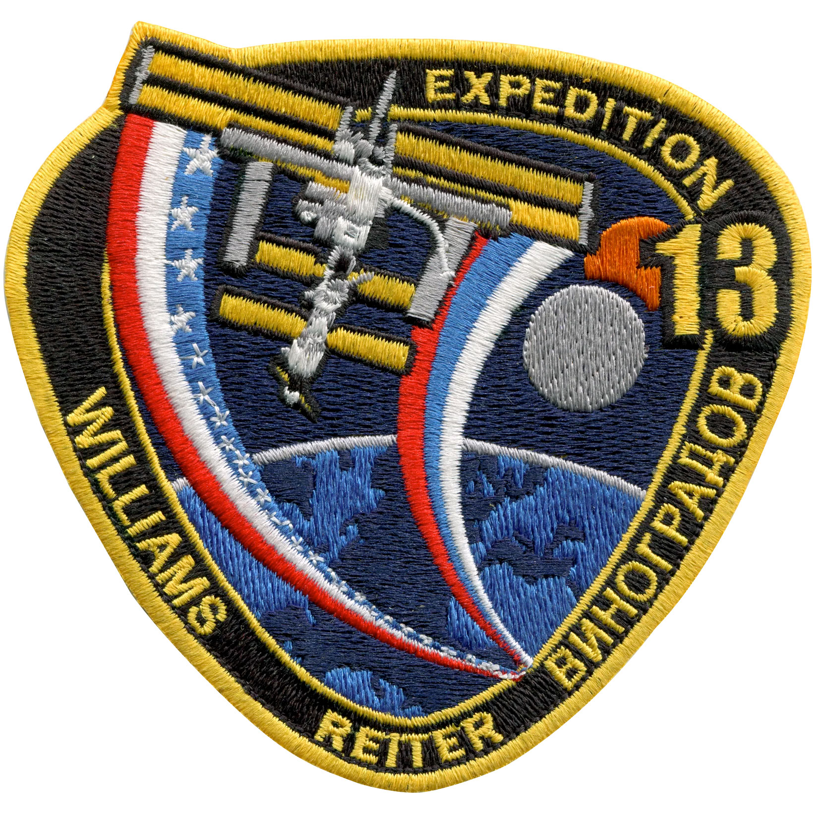 Seems that the patch looks like what AB Emblem tells about it: NASA has approved the Expedition 13 — 3 man crew emblem design adding the name Reiter in the lower part of the emblem. Thomas Reiter is joining the crew and will spend six months on the International Space Station. This brings the crew to three for the first time in three years. Other crew members already on station are Jeff Williams and Pavel Vinogradov. Taking the two name version and add the name "Reiter." |