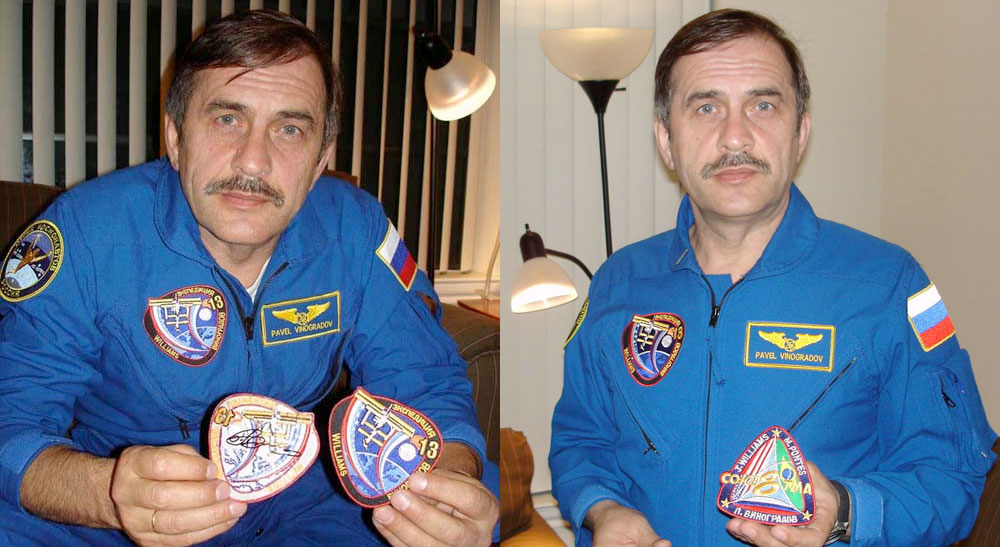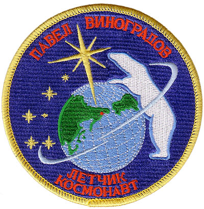 The patch on Vinogradov's left chest is his personal patch. He's from Siberia. It's the Earth from the vantage point of Siberia/Alaska with a star on his hometown. On the right is a polar bear with his front legs on the earth. Then there is the Big Dipper and Polaris star. I think it says in Cyrillic "Vinogradov" and under then Pilot Cosmonaut. I first saw it briefly a few weeks ago.  |