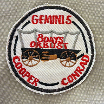 collectSPACE '8 Days or Bust' +50 years: Gemini 5 made history with first crew mission patch...the Gemini 5 mission's planned length was more than just an attempt at a record but a test itself, designed to show that astronauts could survive the time needed for a trip to the moon and back. Cooper and Conrad chose to underline that particular goal while setting yet another American first in space. Sewn to the right chest of each of their spacesuits was a cloth emblem depicting a Conestoga wagon. Embroidered in red lettering was their mission designation ("Gemini 5") and their names. And hidden under a thin piece of hastily-added cloth was the inscription, "8 Days of Bust." Cooper and Conrad were sporting the first-ever astronaut-designed space mission patch.  |