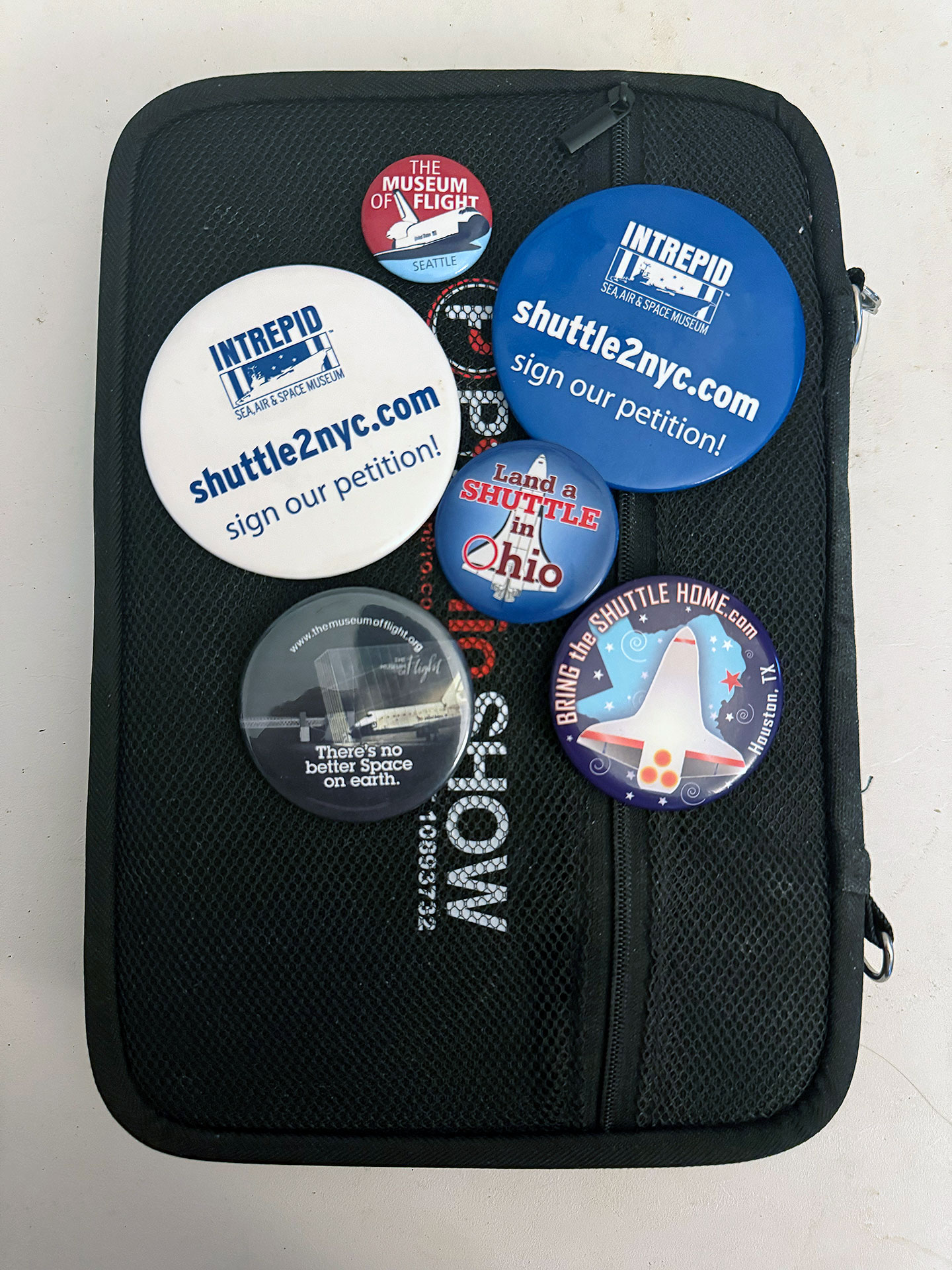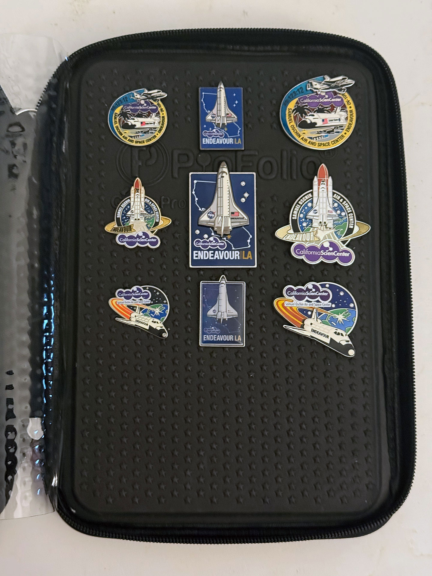 With all the recent talk about moving a retired NASA space shuttle for political reasons, it inspired me to go back through the memorabilia I picked up during the original delivery of the winged orbiters to their museum homes in 2012.The patches have more or less been well documented on this forum, as has most of the medallions, but there were also a good number of lapel pins that were created as part of the process. For those interested, here is a look at the three-page (and a pocket) album I put together.  The front page has a clear cover, so the pins can be viewed even when closed. I used this for the few Discovery and Enterprise pins that were released at the time, as well as some rarer Atlantis and Endeavour pins. I also included (at the bottom) pins for the orbiter trainers and mockups. The first pin flew aboard the Shuttle Carrier Aircraft during its three museum ferry flights. The Kennedy Space Center Atlantis pin preceded the design of the exhibit's logo. The Endeavour pin was distributed by the Inglewood Police Department during the orbiter's road trip to the California Science Center. The second page is a full collection of space shuttle Atlantis pins that were for sale on the day the exhibit opened at the Kennedy Space Center Visitor Complex.  Similarly, the third page is a collection of California Science Center pins featuring three designs in different sizes.  Lastly, the outer pocket holds mostly pinback buttons that either were part of the venues' campaigns to be selected for a shuttle or were from the day of delivery. This set also includes two buttons from Japan, where they had a full-scale stack integrated as part of a roller coaster.