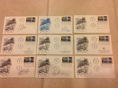 After many years of searching I finally reached my goal of collecting a series of identical first day covers (FDCs), each signed by Neil Armstrong, Buzz Aldrin, Michael Collins, Gene Kranz, Charlie Duke, or Bruce McCandless plus three others bearing a piece of Apollo 11 flown material, to include surface flown film.  I am looking for ideas on how best to display them. I have a very special Spaceflori presentation with flown material that I could incorporate into a display, or perhaps somebody has a better idea. I still have a couple of unsigned covers that I could use. I am open to getting those signed if anyone can think of another key player I may have missed. I have another signed by Gene Cernan that came from his garage sale but am having trouble tying a direct link to Apollo 11. We just moved into a new home and my wife is letting me decorate the basement with space memorabilia. I'd appreciate any ideas you folks might have! |
