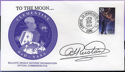 Attached is a photo of one of the launch covers that was produced for the Clementine program through the NASA ARC Stamp Club, with permission from the Ballistic Missile Defense Organization (BMDO). A total of 148 covers were made. Most of these covers were given to the program office for distribution. This cover was signed by Pete L. Rustan, who was the Mission Manager for Clementine, when he was visiting Onizuka Air Force Station in Sunnyvale, CA.  |