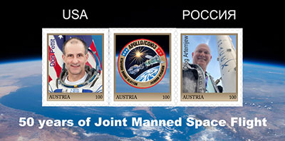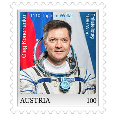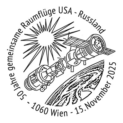 "50 years joint Space Flights USA Russia"This year's ME-3 block of the Austrian Gmünder Weltraumfreunde astrophilatelic society shows the crew patch of the Apollo-Soyuz Test Project and the first veterans of both countries who have been selected for a cruise flight, Don Pettit and Oleg Artemyev.  Pettit landed in the Kazakh steppe on 20.04.2025 — his 70th birthday — with Soyuz MS-26. Before that, he was on the ISS with the space shuttles STS-113 and STS-126 and with Soyuz TMA-03M. Artemyev is scheduled to fly to the ISS for the fourth time with Crew 12 in March or April 2026. On Saturday, Nov. 15, 2025, our special post office will open from 10:00 a.m. to 2:00 p.m. in the rooms of the Philatelic Association VÖPh, 1060 Vienna, Getreidemarkt 1. Austrian Post's Philatelic Day stamp pays tribute to Oleg Kononenko, who set the record of 1,110 days in space on Sept. 23, 2024, which he achieved in five space flights. It is handed in free of charge at the special post office for a purchase of 25 euros (€).  Oleg Artemyev signed C6 and B6 envelopes for us in July 2025 during his training at ESA in Cologne-Porz. The Gmünder Weltraumfreunde offer: - ME-3 souvenir sheet mint, never hinged: 10€