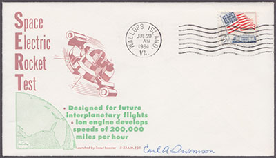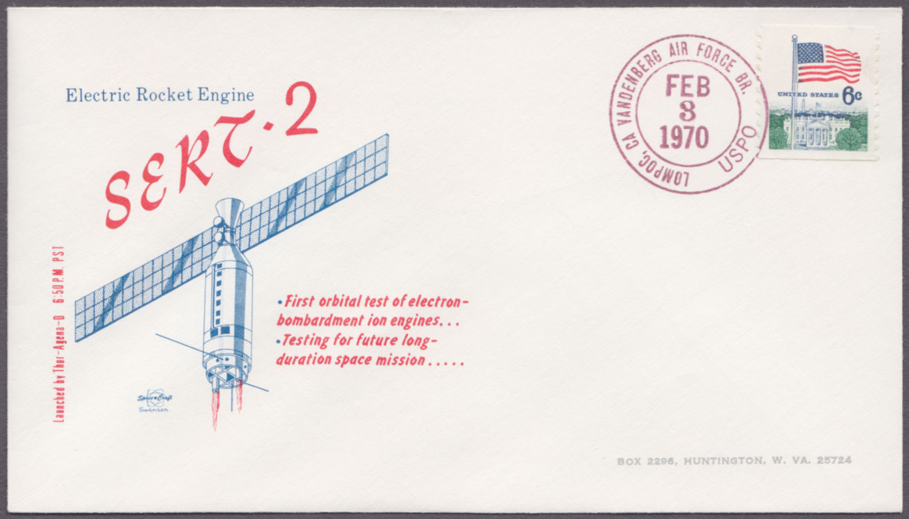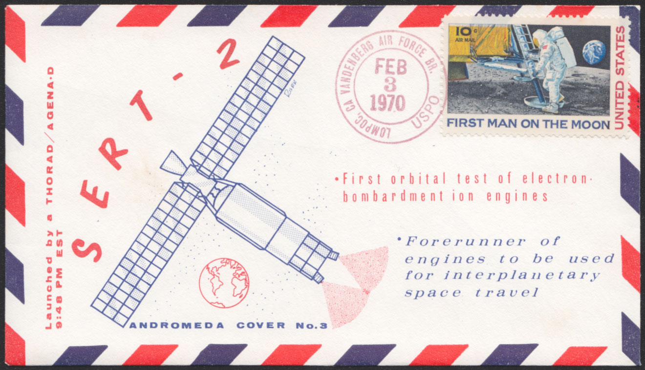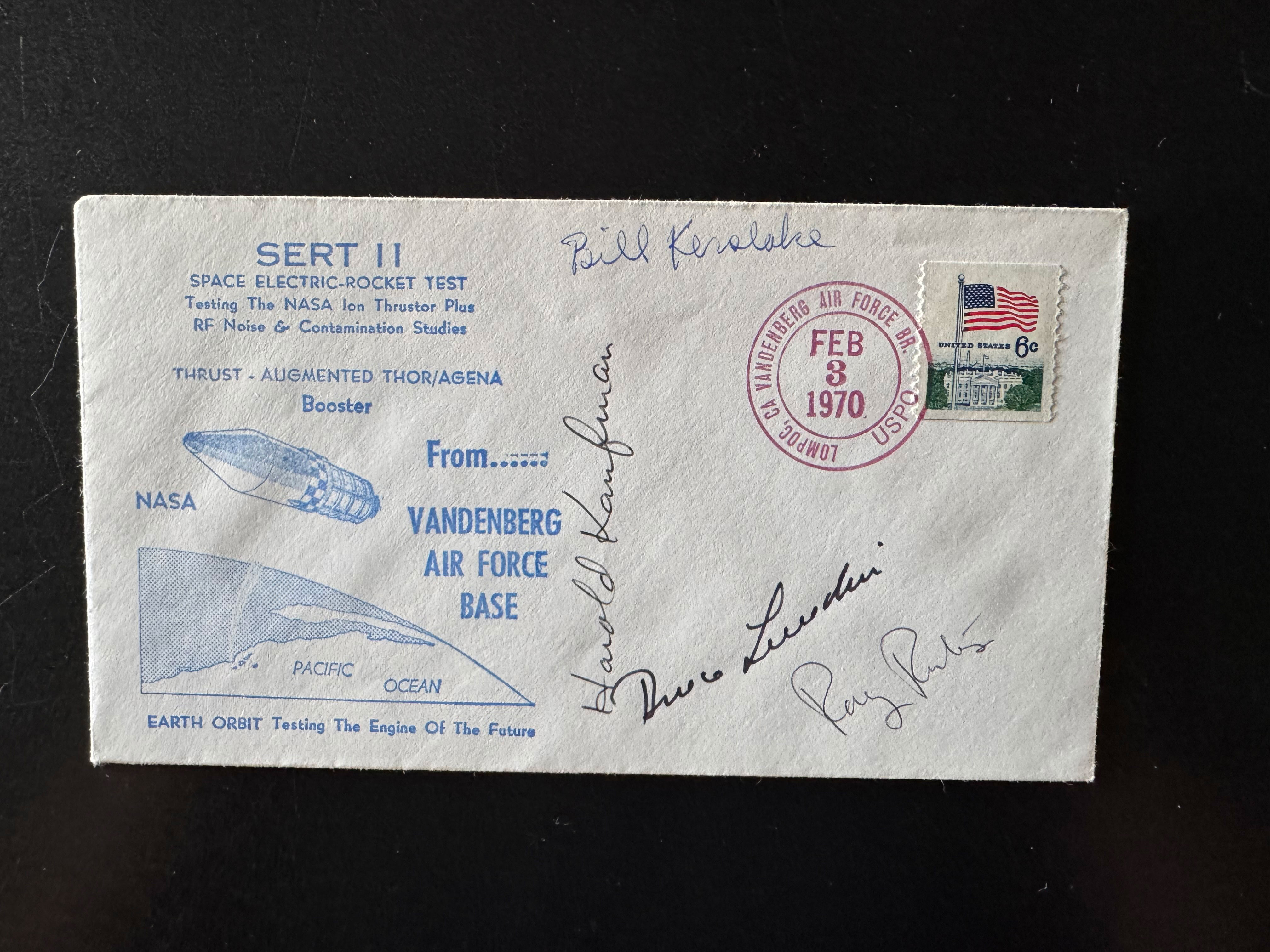 Has anyone seen an autograph space cover for the Space Electric Rocket Test (SERT) series of the mid-1960's to early 1970's? Depicted above is a launch day cover for SERT II on Feb. 3, 1970, from the then Vandenberg Air Force Base (now Vandenberg Space Force Station) on the seaside coast of California. The cover had been signed by Dr. Bruce Lundin, center director of NASA's Lewis Research Center in Cleveland, Ohio, now referred as NASA Glenn Research Center since March 1999 to honor astronaut pioneer John H. Glenn Jr. Three of the other signatures on the rubber stamp cachet cover are not too well known, however, they represent a genuine new space technology success story. You can see the autograph of Lewis' top project engineer, Harold Kaufman, in the middle of the cover. His first electron-bombardment ion thruster engine design was on SERT I in July 1964. Another prominent autograph is that of SERT's experiment manager William "Bill" Kerslake, developer of the ion thruster system at the top of the signed cover. The signature at bottom right is SERT II project manager Raymond "Ray" Rulis, who called the launch of SERT II the "smoothest operation I've seen." SERT II, launched by a Thor-Agena D rocket, was to test the long-term operation of an ion engine in space. Of the twin liquid-mercury fueled ion engines, both verified that new ion thruster technology could indeed operate for long durations in space without damaging other spacecraft systems and solar allays. Ion thruster propulsion is an electric propulsion system that uses electrostatic energy to accelerate ions to high speeds, creating trust for spacecraft. Unlike chemical rockets, ion energy produces very low thrust over long periods, making them ideal for deep space missions, orbit transfers, and attitude control. SERT II provided researchers with data for years beyond (until 1990) and was a rare example of an entire flown mission — including the launch, propulsion systems, spacecraft, and control center — all being handled by one organization: then NASA Lewis. On Feb. 14, 1970, NASA Lewis engineers and scientists activated SERT II's first ion thruster, beginning its six-month operational test period. Three weeks later, controllers shut the thruster down just before the vehicle passed through the path of a solar eclipse. It was restarted successfully afterwards and continued working later that same day. For another five months, SERT II operated without any issues until an electrical short disabled it. On July 22, 1970, the second thruster was started up having worked successfully for 14 weeks. The same polar orbiting spacecraft was reactivated in 1973 after flight controllers had fixed the electrical short from ion #1 that resulting in over 500 engine restarts during 18,000 hours before the propellant ran out in the spring of 1981. Providing data for decades helped in developing an array of rocket propulsion technologies, such as the NSTAR that powered the Deep Space and Dawn spacecrafts. In support of the agency's Artemis missions, NASA Glenn is now testing similar thrusters that will power Gateway, a future lunar space station. |