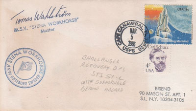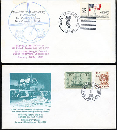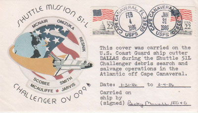 Tom, thanks for remembering the job of Bob Boudwin on this accident. It could not have been easy to do this at that moment, with so much pain from the lost of entire crew and space shuttle. Fortunately for collectors, he was not the only one. Below a cover postmarked Cape Canaveral at the departure and arrival to port, carried on US Coast Guard Ship Dallas, which also participated in search debris.  |