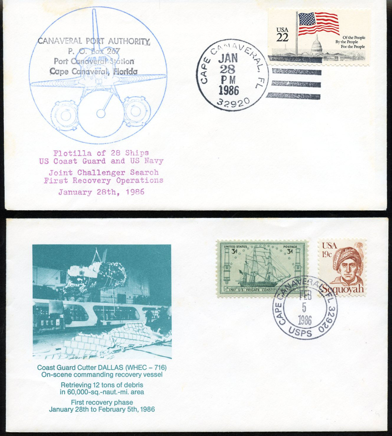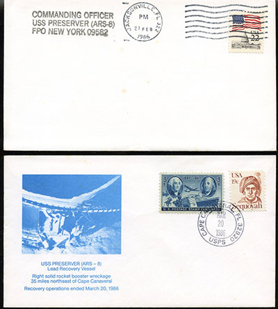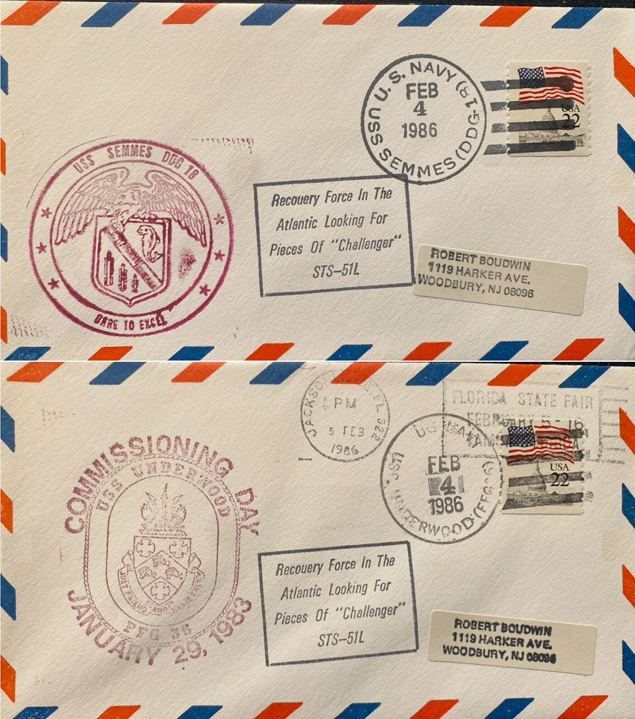 Space Cover of the Week, Week 830 (November 2, 2025) Space Cover 830: STS-51L Salvage Operations After the Challenger (STS-51L) exploded 73 seconds after liftoff, on January 28, 1986, a massive rescue and recovery effort was started eventually involving a flotilla of 28 US Navy, US Coast Guard and civilian vessels which lasted for several months - from the date of the explosion through August 1986. Tragically, there were no survivors, however a significant amount of shuttle debris was found, including the remainder of the vital Solid Rocket Boosters (SRBs) in mid-February. This recovery effort eventually led to the discovery of the problem with the SRBs and this led to a major redesign of the SRB. Covers are known from all 28 ships involved and are typically found with postmarks between February and early May as the main shipboard salvage operations wound down in late April and early May. Ships without an onboard post office can have postmarks from multiple on-shore locations - even multiple locations for the same ship. In addition to the flotilla of 28 ships, some additional ships that were involved in the recovery effort were commercial ships involved in the deep water salvage operations, surface and shallow water salvage effort, and auxiliary vessels. Collectors can thank cover servicer Bob Boudwin for most of the earliest covers from these ships. As there was no "official" list of participating ships (and essentially no Internet information either), Boudwin had to spend countless hours on the phone with his many sources of information around Cape Canaveral to piece together which ships were participating. Shown above are covers with ship RSC Boudwin received from two of the ships - USS Semmes and USS Underwood. The text box with 'Recovery Force In The Atlantic Looking For Pieces Of "Challenger" STS-51L' was added by Boudwin to all the covers he received. To acquire postmarks of February 4 - Boudwin had to have learned of the ships' participation in the recovery, prepare covers and mail to the ships from New Jersey, the covers arrive on the ship and get postmarked - all within a week! |