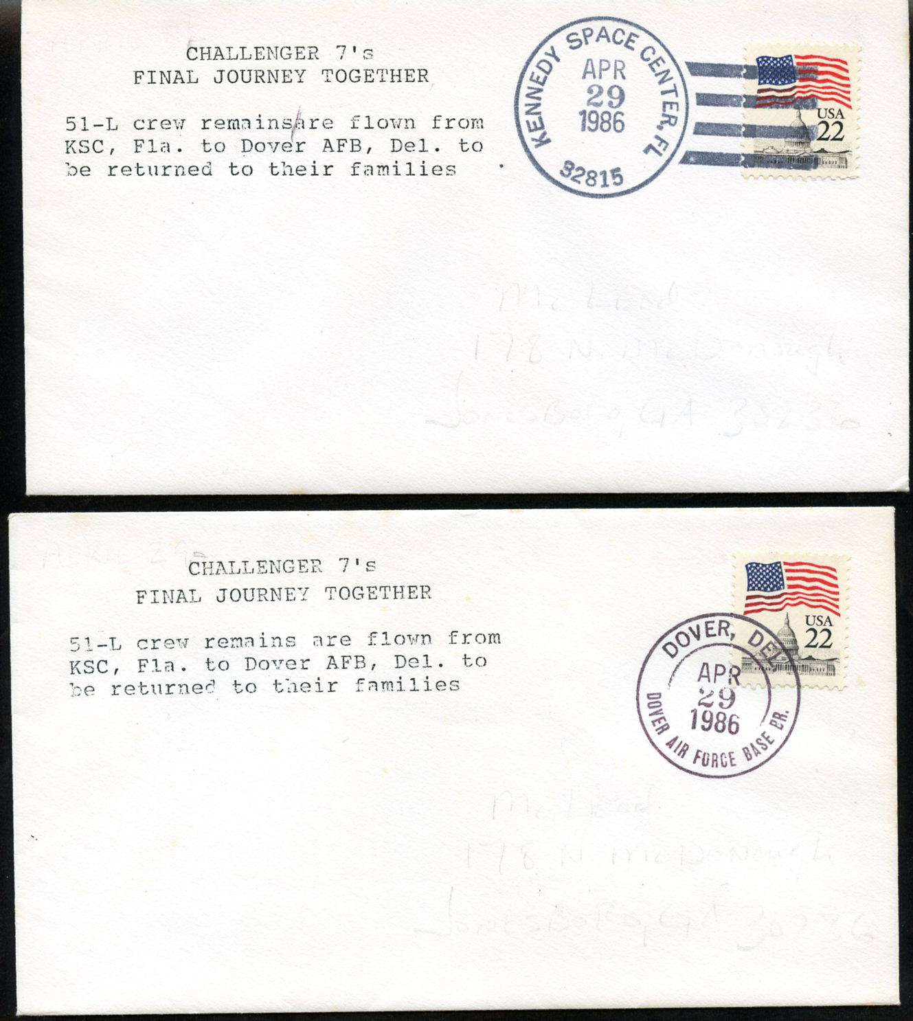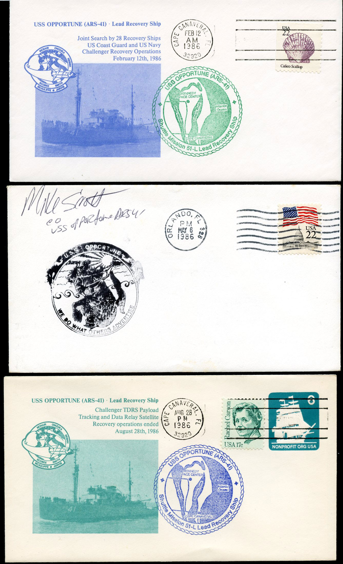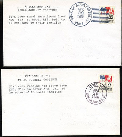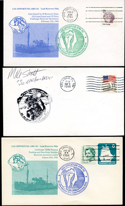 Here are more covers relating to the Challenger salvage operations.The top cover is from the Canaveral Port Authority and marks the first day of recovery operations. Below it is a cover for the Coast Guard Cutter Dallas that was involved in recovering 12 tons of debris. These three covers relate to the USS Opportune that was the lead recovery ship. The top cover marks the start of recovery operations and the bottom cover marks the end of recovery operations, with the cover in the middle from the USS Opportune and signed by the Commanding Officer. The top cover is from the USS Preserver and is canceled early in the recovery operations. The bottom cover is canceled for the end of the right side Solid Rocket Booster wreckage recovery operations. The top cover has the USS Sunbird's ship's cachet and is signed by the ship's commanding officer. The bottom cover has the submarine NR-1 ship's cachet and canceled on April 17, 1986 for its return to the Groton, CT submarine base. To continue this topic further and to include a morbid subject, here are two covers marking the transfer of the Challenger crew's remains from KSC to Dover, Delaware to be returned to their families. As an aside, I noted that I gave a pair of these KSC/Dover covers back at that time to six fellow collectors and wonder if any can now find them buried in their collections?: John Macco, Tim Preston and Ken Havekotte, with the following no longer with us: Bob Preston, Harry Rose and Dennis Dobbins. Hard to believe that in January it will be 40 years since the Challenger tragedy! |