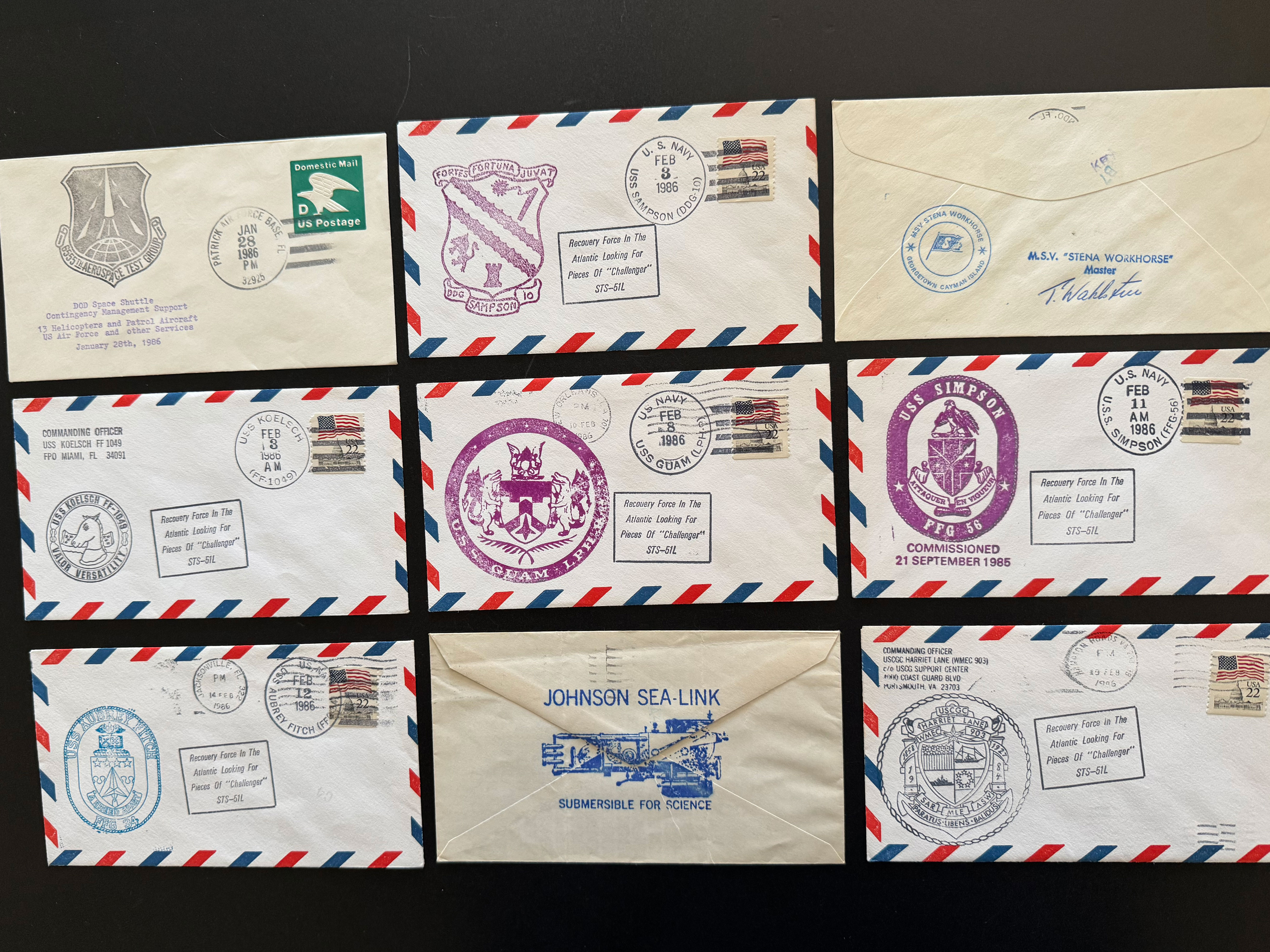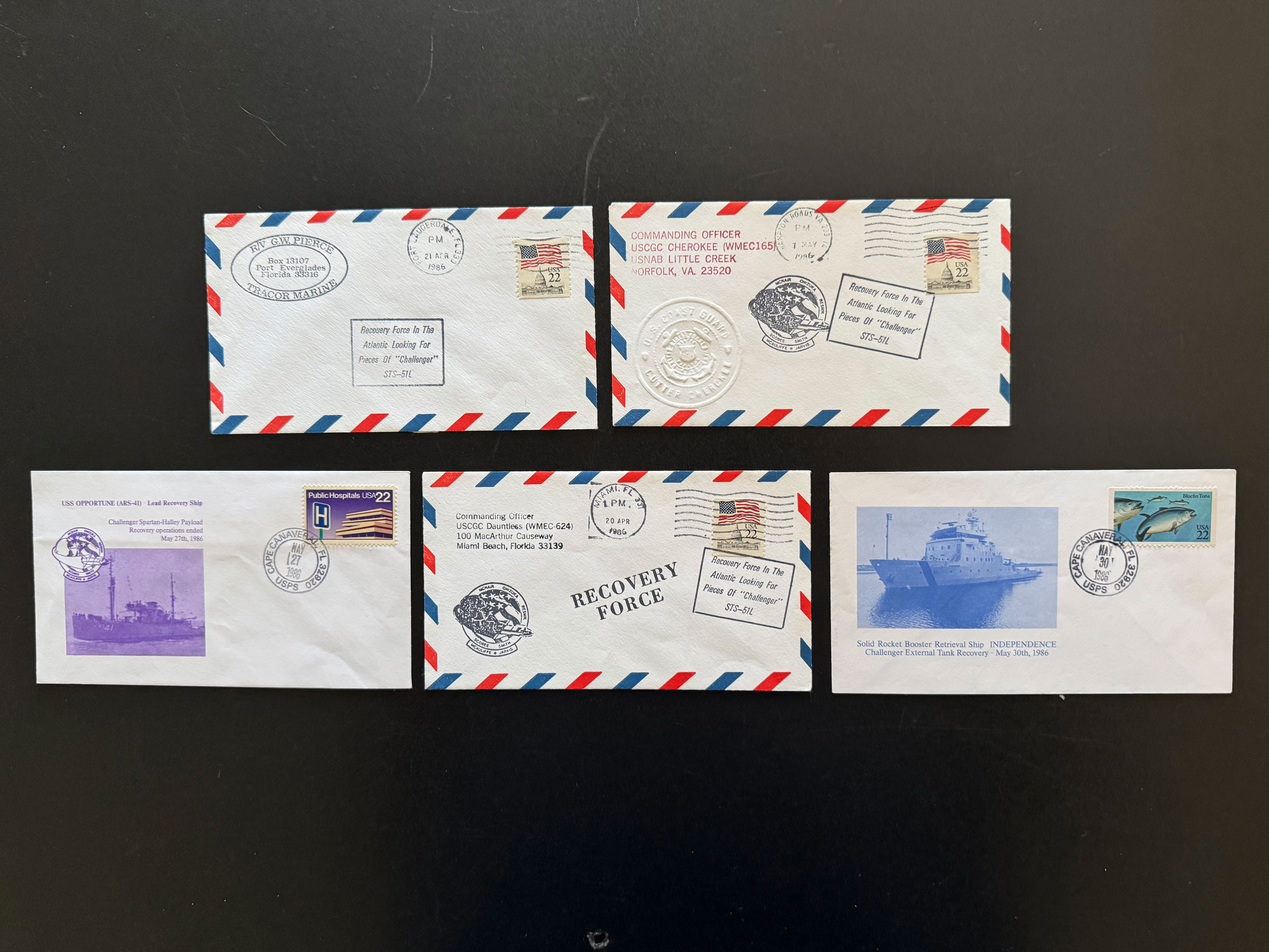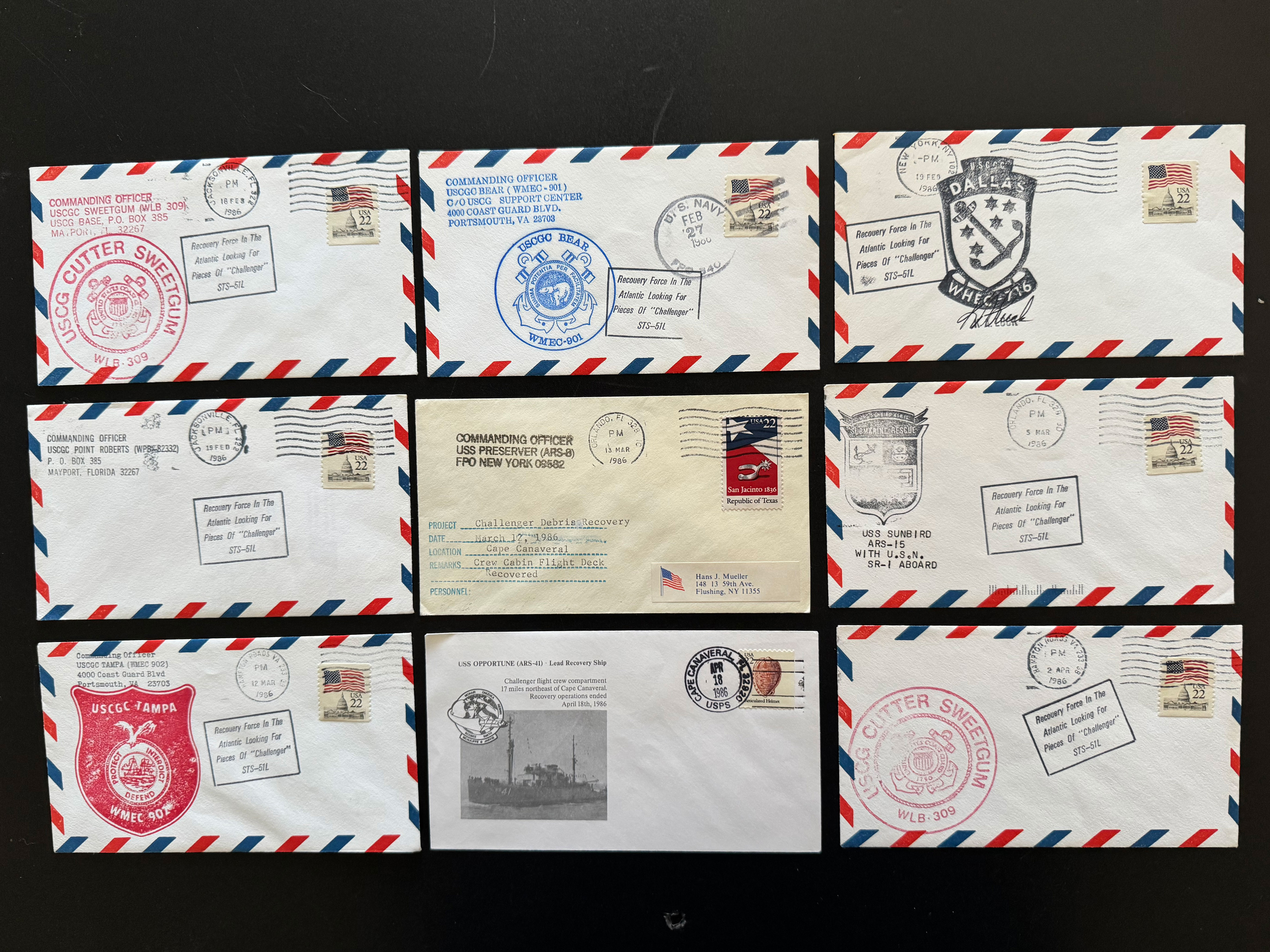 Here are about a couple dozen more different Shuttle 51-L/Challenger mission debris search and salvage covers from the Atlantic Ocean throughout January to May 1986. Others may be included later.The carried 51-L mission cachet cover that Antonio depicted was one of only 11 covers carried onboard the U.S. Coast Guard Cutter Dallas for when the high endurance cutter left Port Canaveral on Jan. 31, 1986, and came back to the harbor port on February 4 after its mission had been completed. The 375-foot long Hamilton-class cutter, which usually carries more than 150+ ship personnel, was the main on-scene command vessel for the Atlantic search and salvage operations.