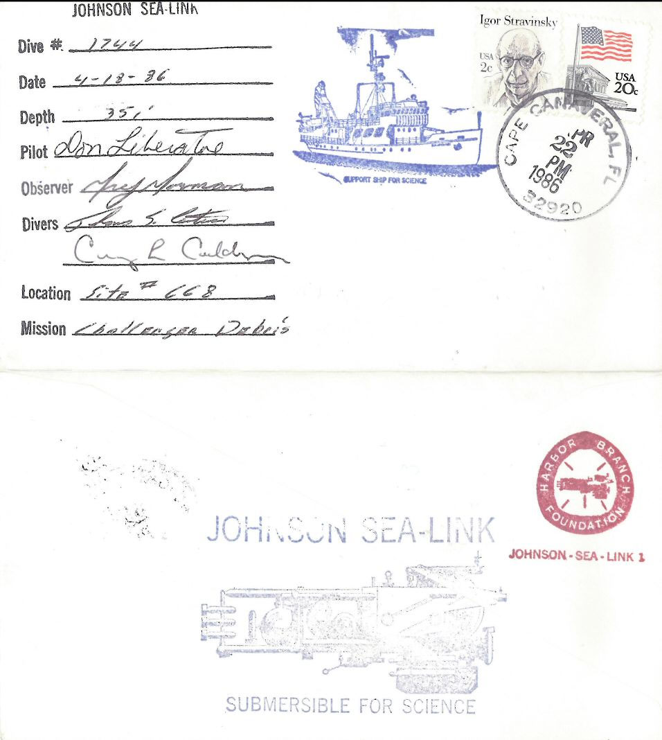 One the most difficult covers to find (I have yet to acquire one) is the Johnson Sea-Link 1 (as opposed to the Sea-Link 2 which is more readily available). Out of interest I was lucky enough to acquire a collection of over 50 Johnson Sea-Link 2 covers, all from different dives. A real highlight of my STS-51L collection. |