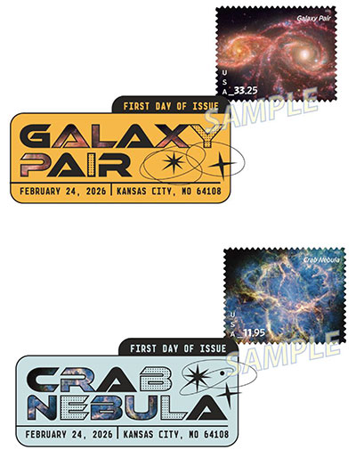 For the third year in a row, Priority Mail stamps in 2026 will feature images of the universe as captured by orbiting observatories. The Priority Mail and Priority Mail Express postage depict views of the Crab Nebula and a galaxy pair, respectively.