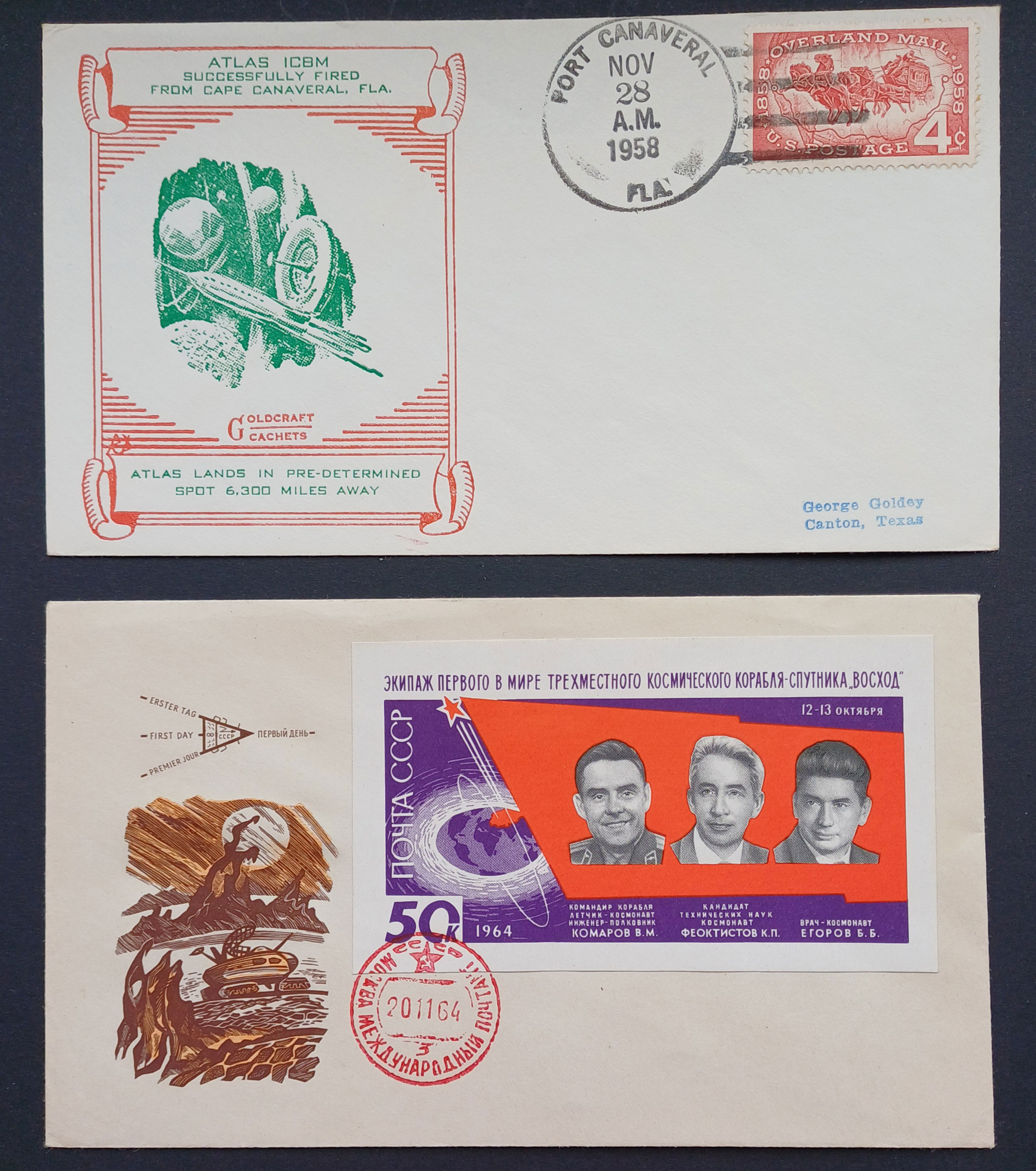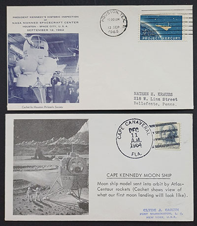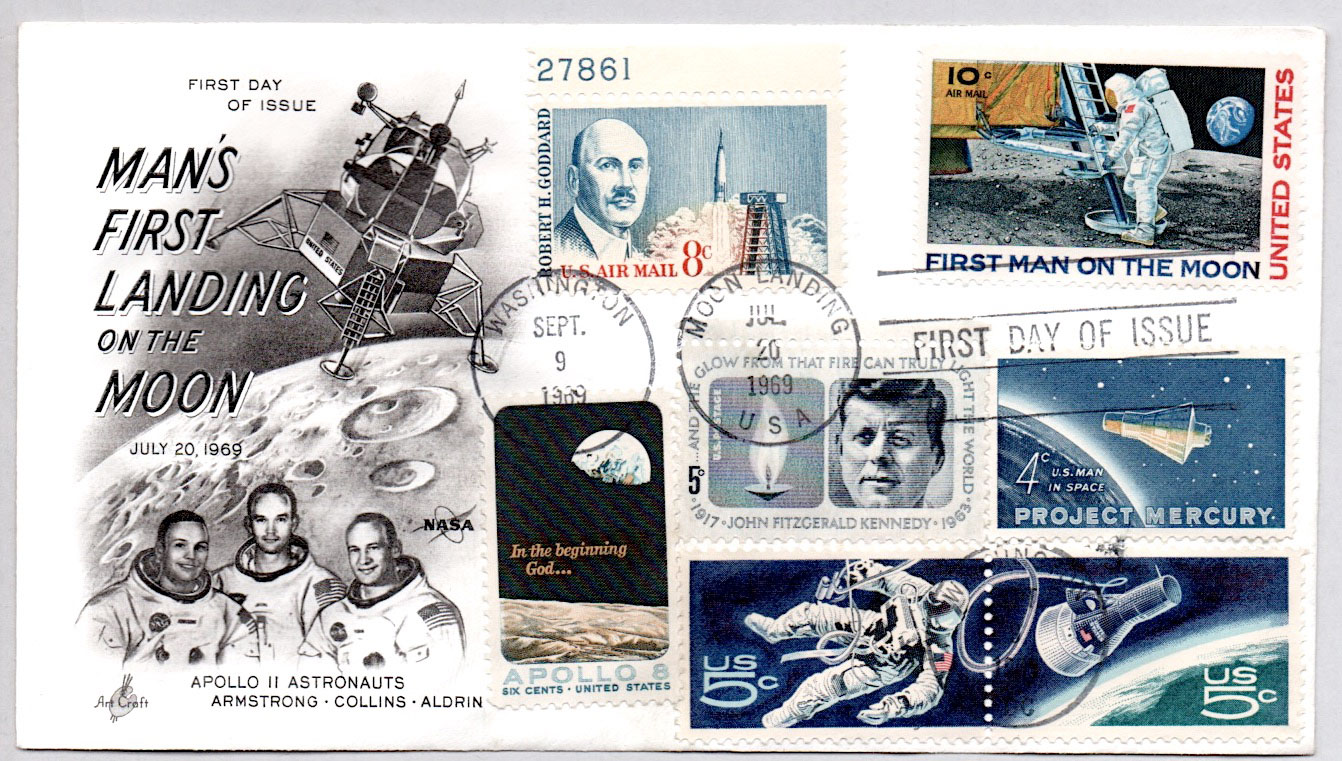 This combo stamp First Day Cover includes an excellent summary of space history. Depicted is the Apollo 11 moon landing, rocket science pioneer Robert Goddard, President John F. Kennedy, Apollo 8 Earthrise, Project Mercury, and Ed White's Gemini spacewalk, which is another of my father's stamp designs.