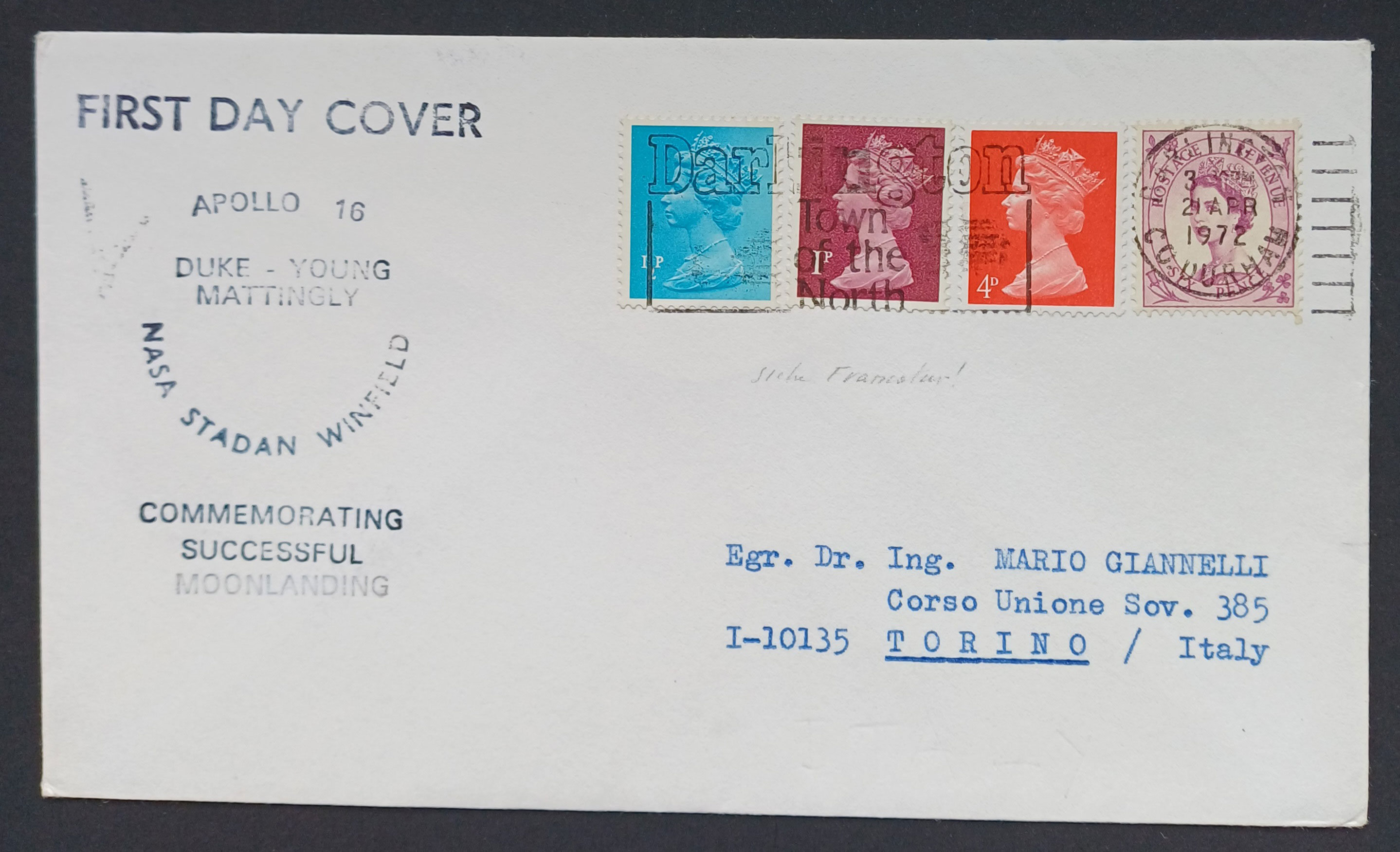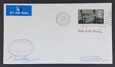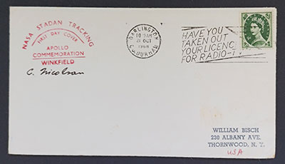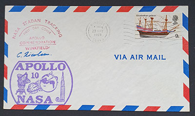 Confusingly the Apollo 10 also has the same "First Day Cover" cachet, and also signed by Nicolson. Although in this case the cancellation is from the actual post town for Winkfield. - The Apollo 16 cover look to be an obvious fake. To start with Winkfield is spelled incorrectly as Winfield on the cachet. That cachet differs from the previous two types of cachet, but also repeats the mysterious "First Day Cover" only larger this time.