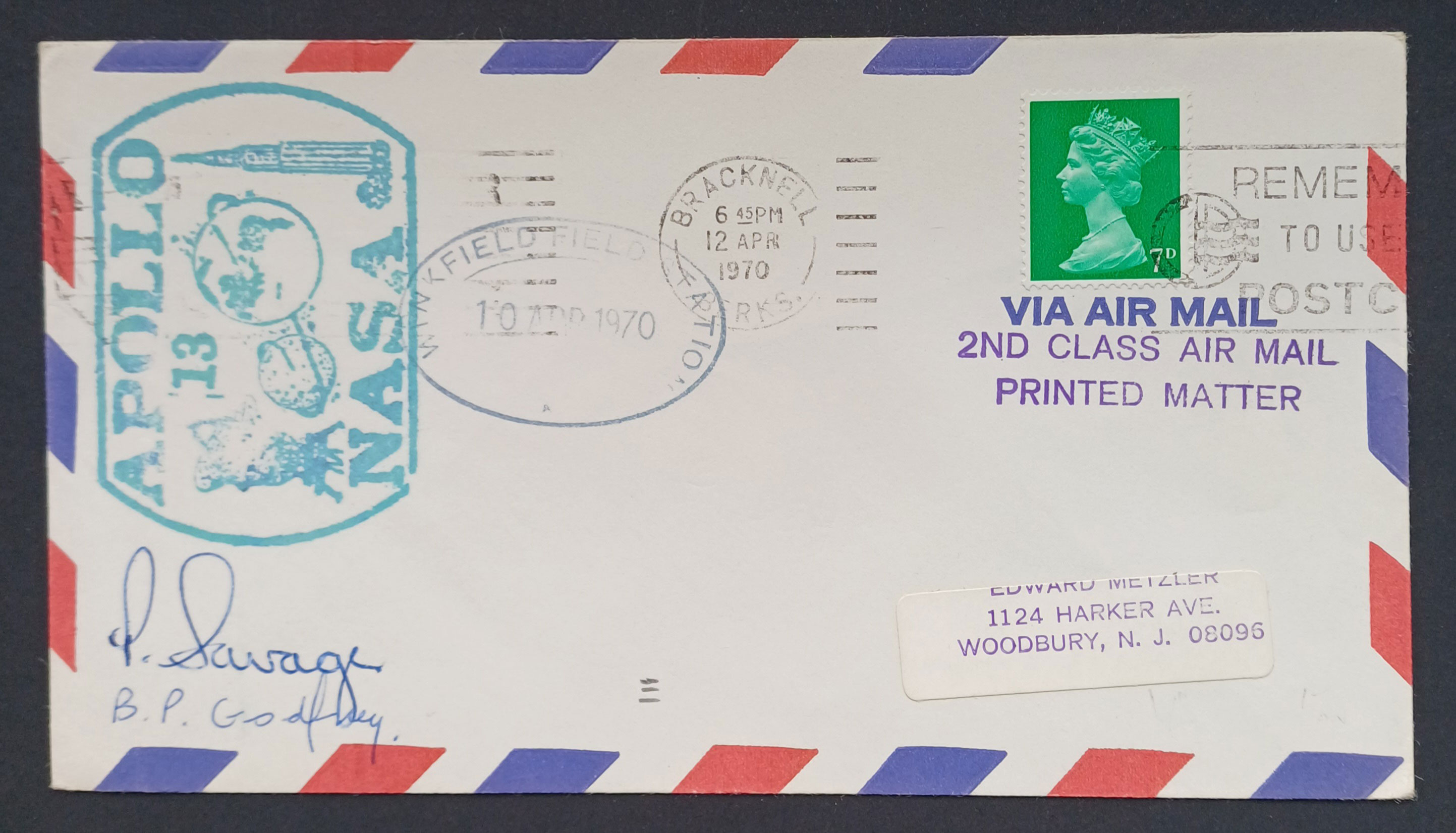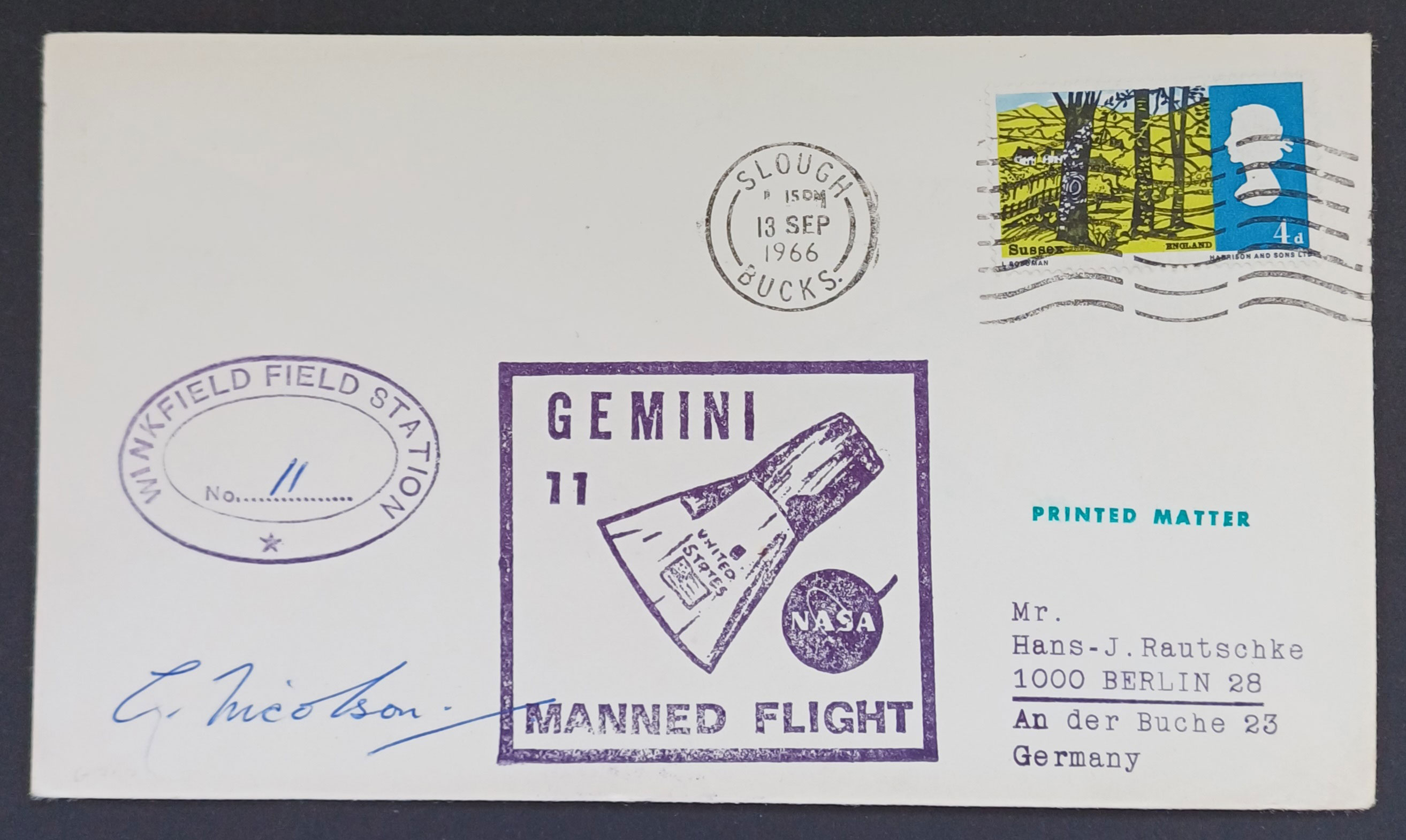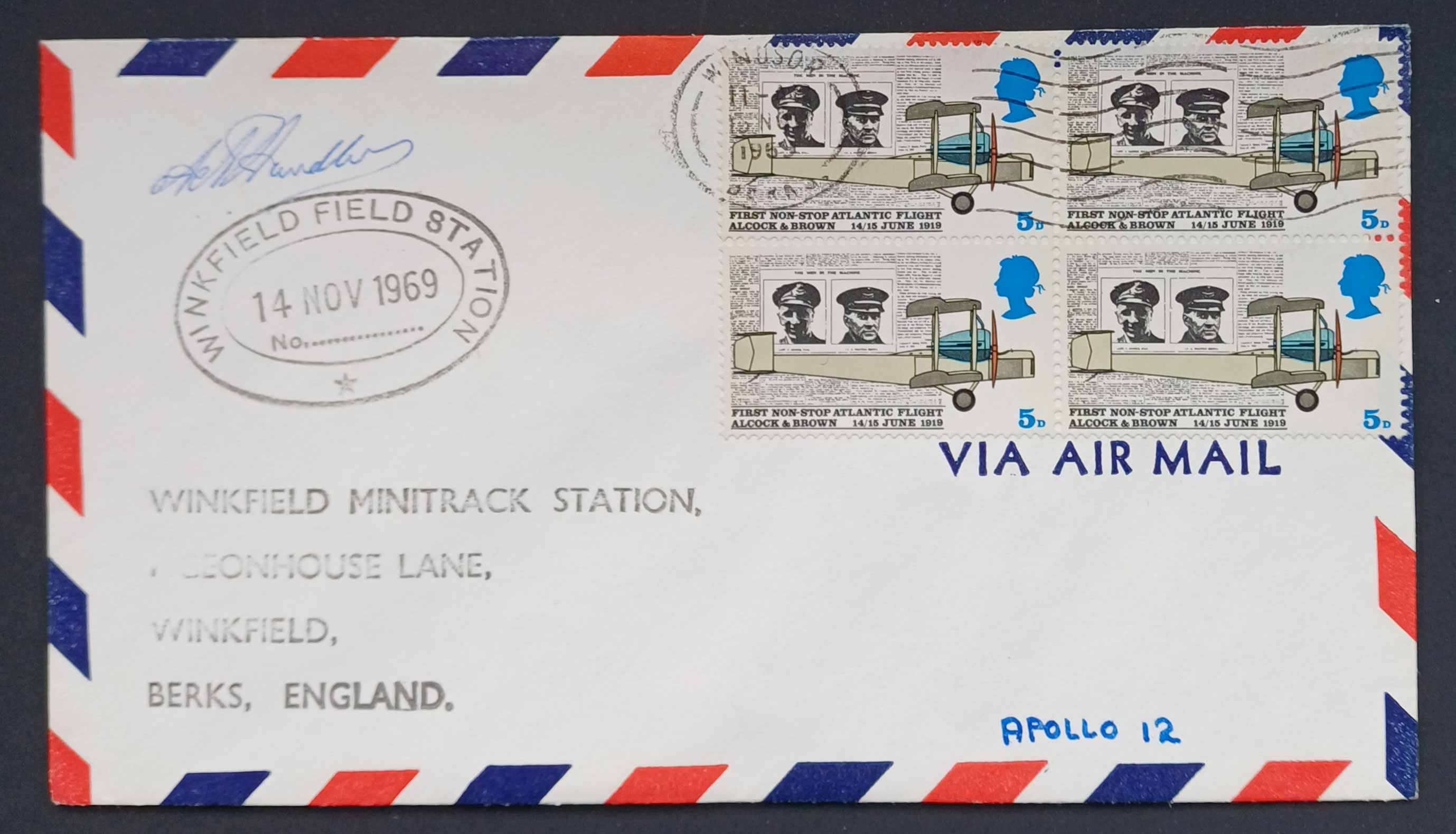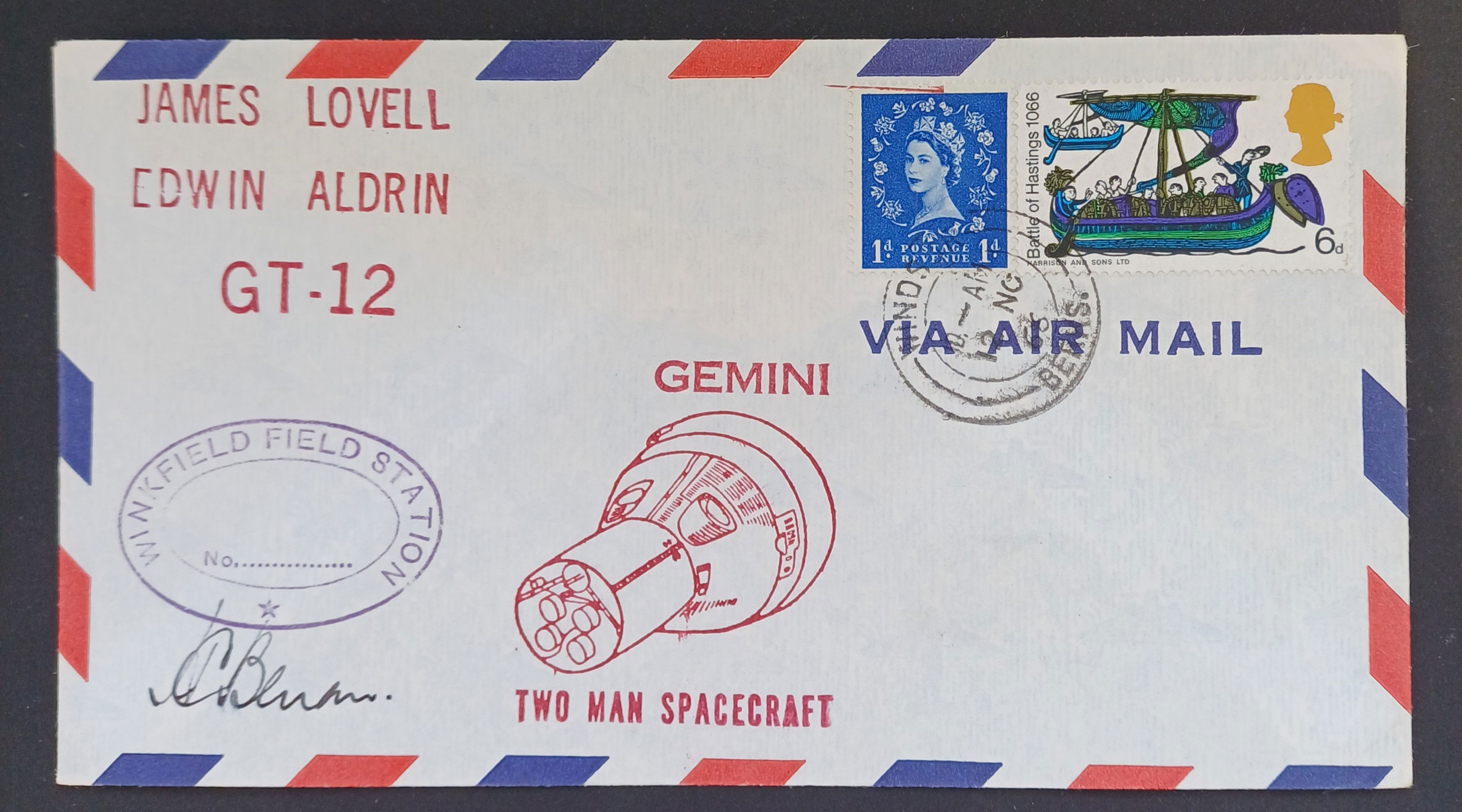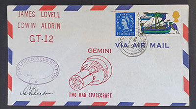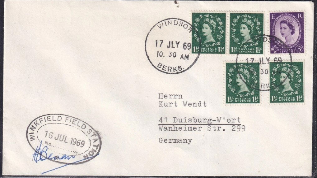Eleven of the above sixteen are perfectly acceptable to me and present no conundrums. Five however require explanation. The Apollo 14 catalog entry? — what? Between 20th January and the 18th March 1971 Britain underwent a postal strike, the first and only postal strike in the UK. There would not be any official mail services available at all during those dates, and it would be impossible to find a stamped cancelled Royal Mail cover. Local semi-official emergency postal services did operate, and their postage labels on cover are a specialist area of collection within GB philately. I would be intrigued to see what cover the McMahan catolog could possibly refer to. Photo anybody? The other four requiring explanation are those postmarked Darlington? - what? Darlington is a town in the north-east of England in County Durham, 266 miles from Winkfield. What possible connection is there between Winkfield Berkshire and Darlington County Durham. The McMahan catalogue cannot be regarded as conclusive because out of the nine Winkfield covers I've so far managed to add to my collection, more than half of them are unlisted by McMahan. My covers are ... | MISSION | CACHET SHAPE | SIGNED | [COVER CANCEL] | | Gemini 9a | oval | signed (C) | [Slough] | | Gemini 11 | oval | signed (C) | [Slough] | | Gemin 12 | oval | signed (A) | [Windsor] | | Apollo 7 | semicircle | signed (C) | [Darlington] | | Apollo 10 | semicircle | signed (C) | [Windsor] | | Apollo 11 | oval | signed (A) | [Windsor] | | Apollo 12 | oval | signed (B) | [Windsor] | | Apollo 13 | oval | signed (D + E) | [Bracknell] | | Apollo 16 | circle | unsigned | [Darlington] |