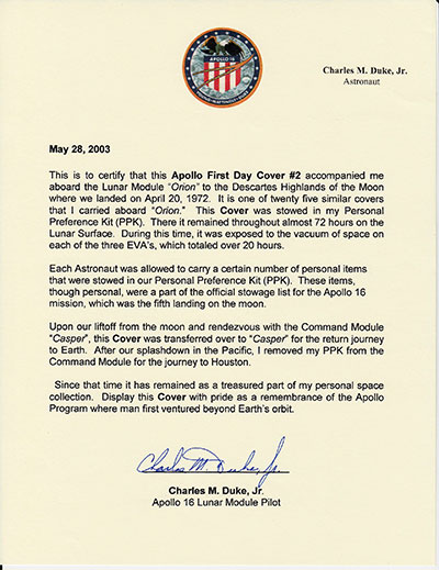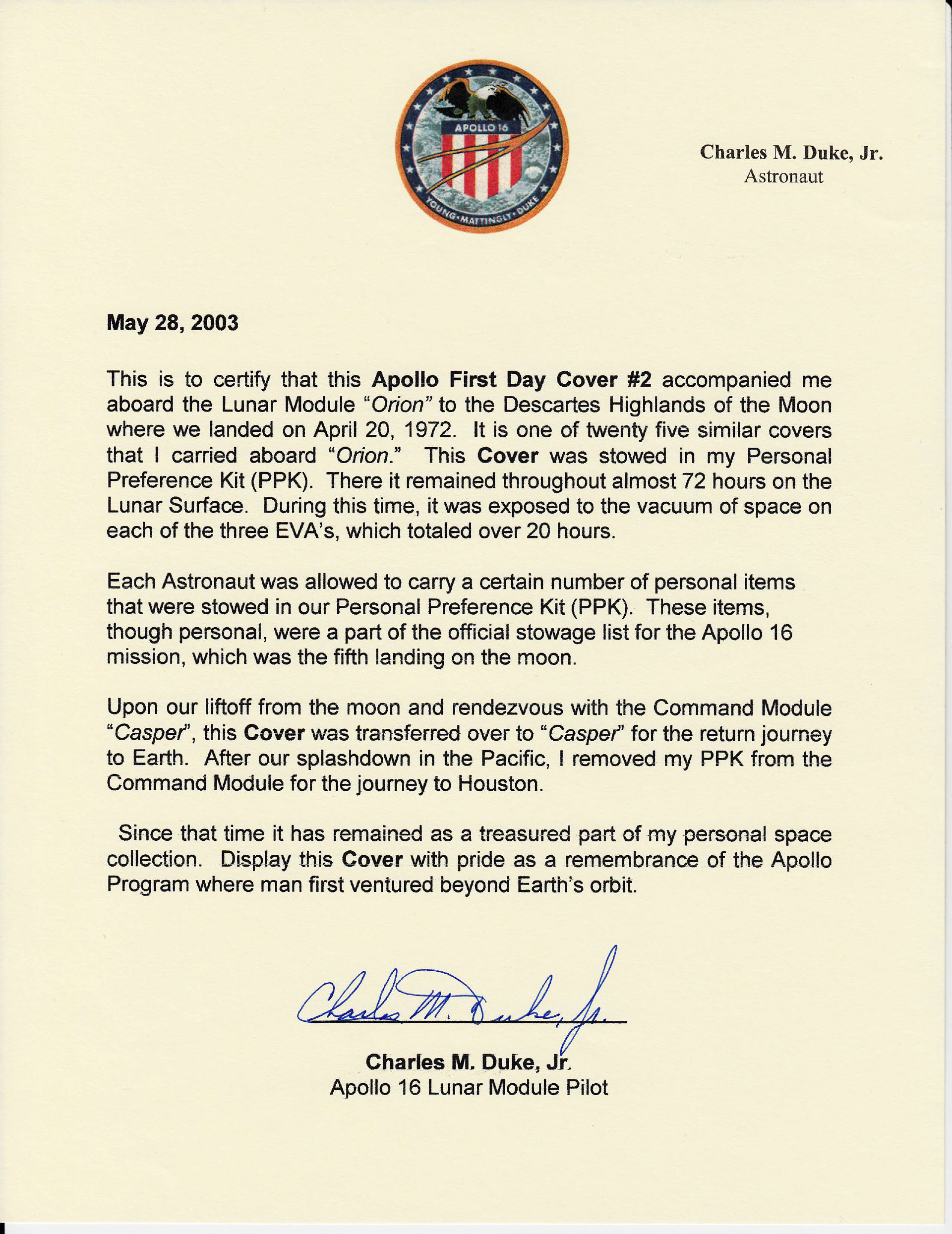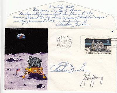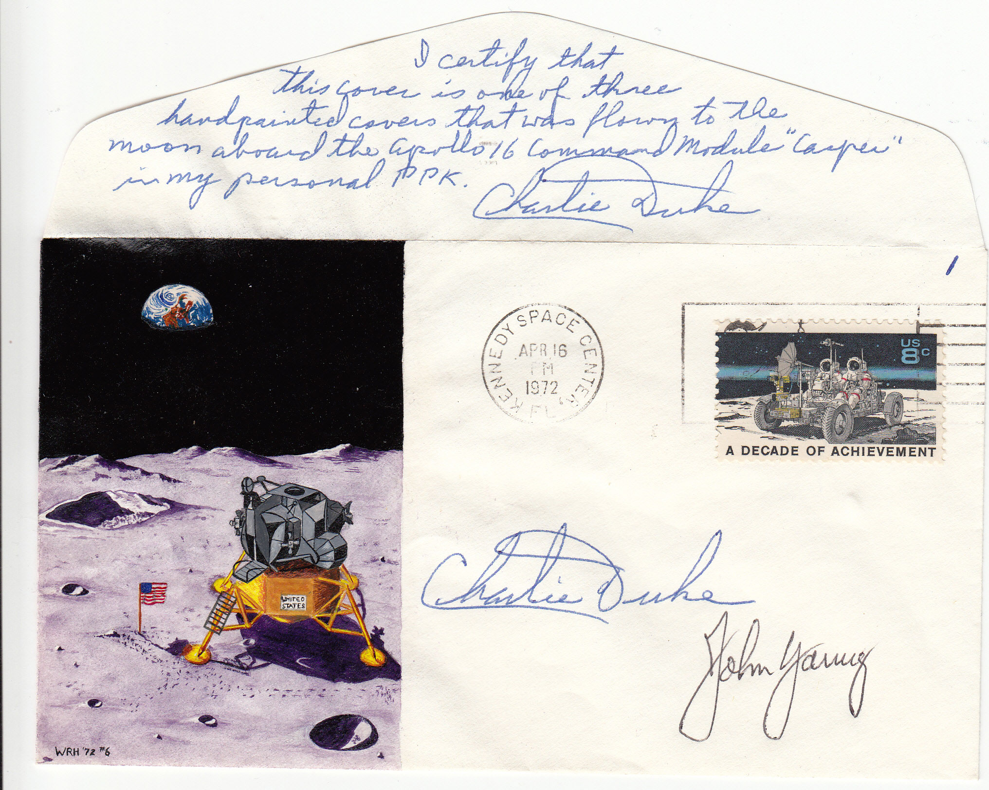Ken, I congratulate you for the purchase of this great Apollo 11 cover flown to the Moon. Charlie Duke wrote a certificate on the flap of both Apollo 16 moon covers in my collection. By the way: Charlie wanted to leave the three covers illustrated by William R. Hanson in Earth orbit. However, I do have copies of letters from Charlie and Dotty to Bill Hanson from 1972 that all three eventually reached the lunar surface. In April 2014, Ken Mattingly signed both covers at his lecture in Pontefract, England.