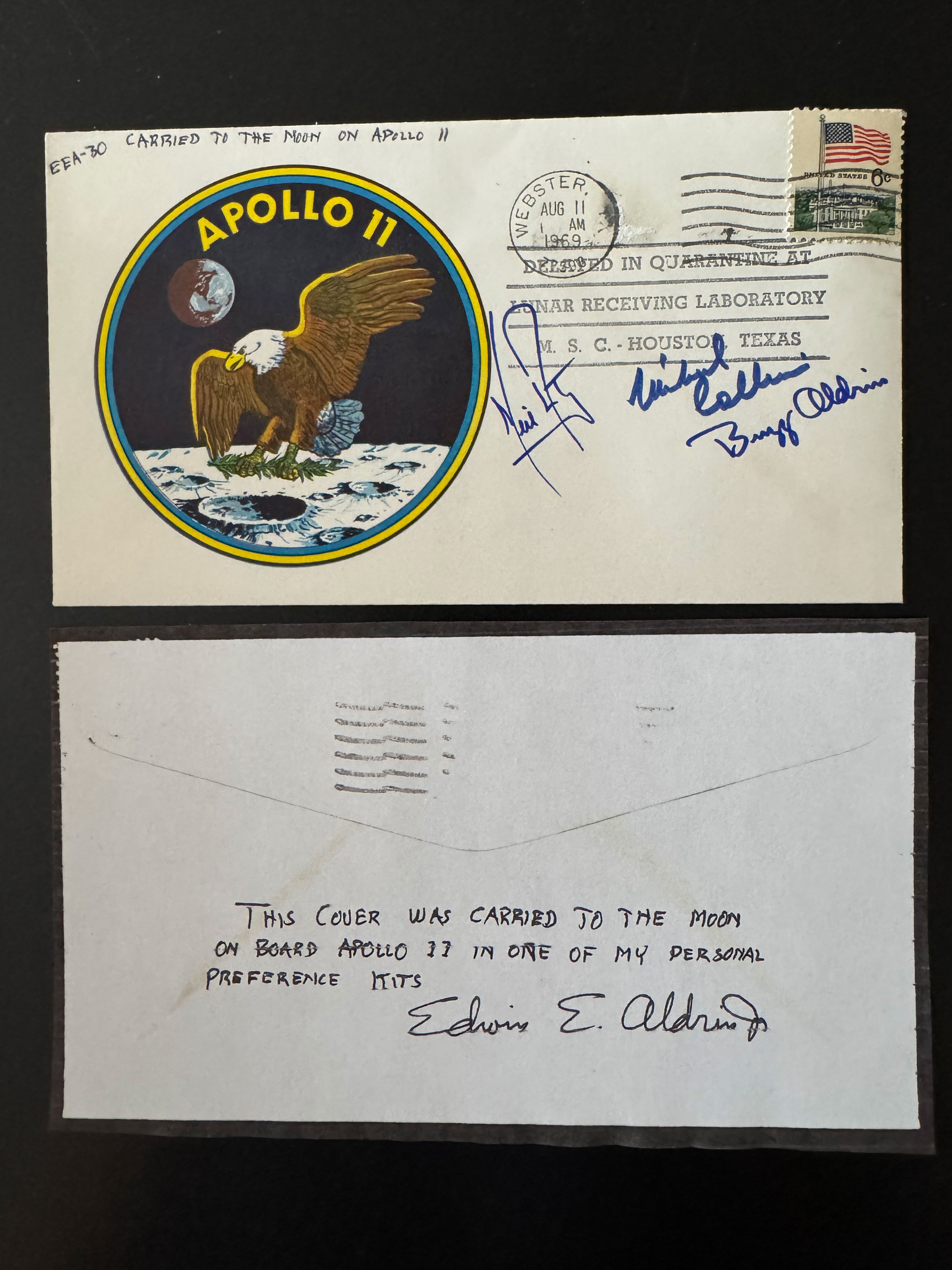 I've waited decades in trying to acquire (and afford) a flown Apollo 11 moon cover with something different or unusual than all the others that flew on humanity's first lunar landing mission in July 1969. This particular lunar cover found a new owner, but first by premier space collector Jacques Bracke that he had requested and purchased way back in June 1980 from the Buzz Aldrin family just over ten years after the historic maiden lunar landing voyage. It was labeled by the lunar module pilot as "EEA-30 Carried to the Moon on Apollo 11" at top left of the envelope. The Type 3 crew-mission emblem cover was also signed and inscribed by Aldrin as seen on the cover's reverse side, "This cover was carried to the moon on board Apollo 11 in one of my personal preference kits (signed) Edwin E. Aldrin Jr."  It's my belief that most, if not all, flown Apollo covers to the moon were not inscribed or notated in such a unique way until the practice started with Jim Irwin after Apollo 15 in 1986 when requesting for one of his flown lunar surface covers. Does anyone else know of an Apollo 11 flown cover that had been signed-inscribed in such a special way on the cover's reverse or back-side? Just flown covers and not crew insurance covers. |