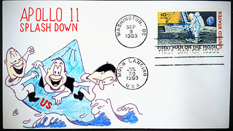 For the First Man on the Moon stamp Ellis created three different cachets (launch, moon landing and splashdown). He also created hand-colored cachets for mission events for Apollos 12, 13, 14, 16 and 17 and other space-related stamp FDCs such as Skylab, ASTP, Viking and others. This cover is an example of what I call a 'cartoon' cachet.