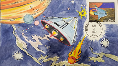 The next cover, with a hand-painted cachet, is a First Day Cover for a stamp depicting a futuristic space shuttle. The designer, Ken Hodges, an artist who specializes in space, was asked by the US Postal Service to create an imaginary space scene set in the future and he submitted four paintings for consideration. The one chosen shows his imagined spacecraft flying over a planet with another planet in the background.