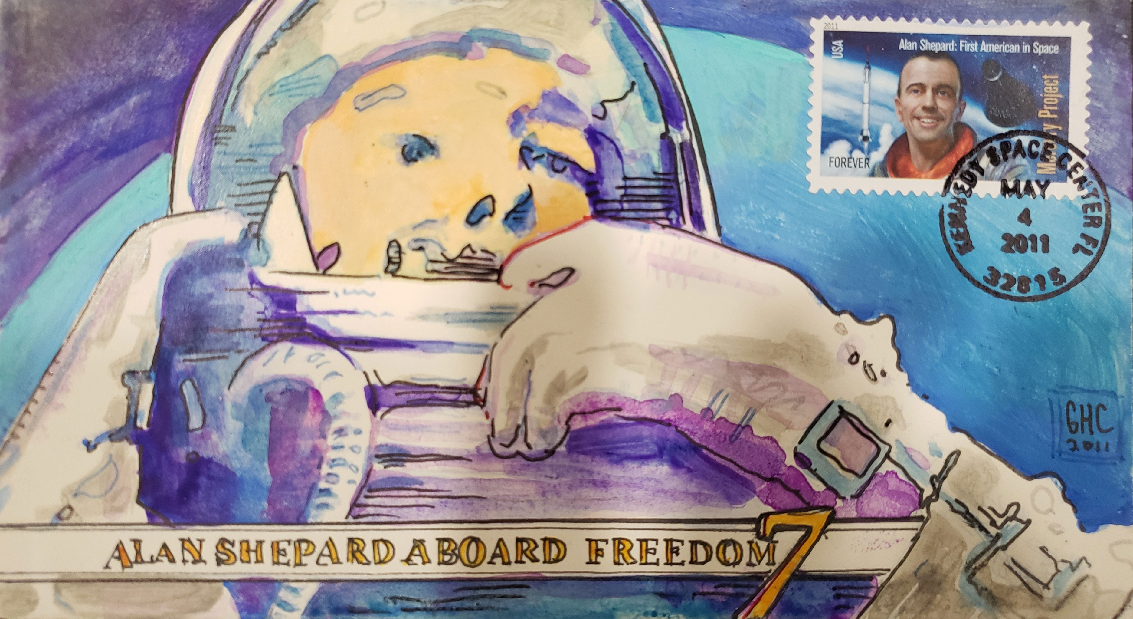 The third cover has a hand painted cachet for the First Day of Issue of the Alan Shepard stamp. The artist used a frame from the pilot observation movie camera mounted inside the Freedom 7 spacecraft that was used to observe Alan Shepard during his suborbital flight. Instead of painting the scene using sharp lines and edges the artist used a more 'abstract' approach in capturing Shepard inside the Mercury spacecraft
