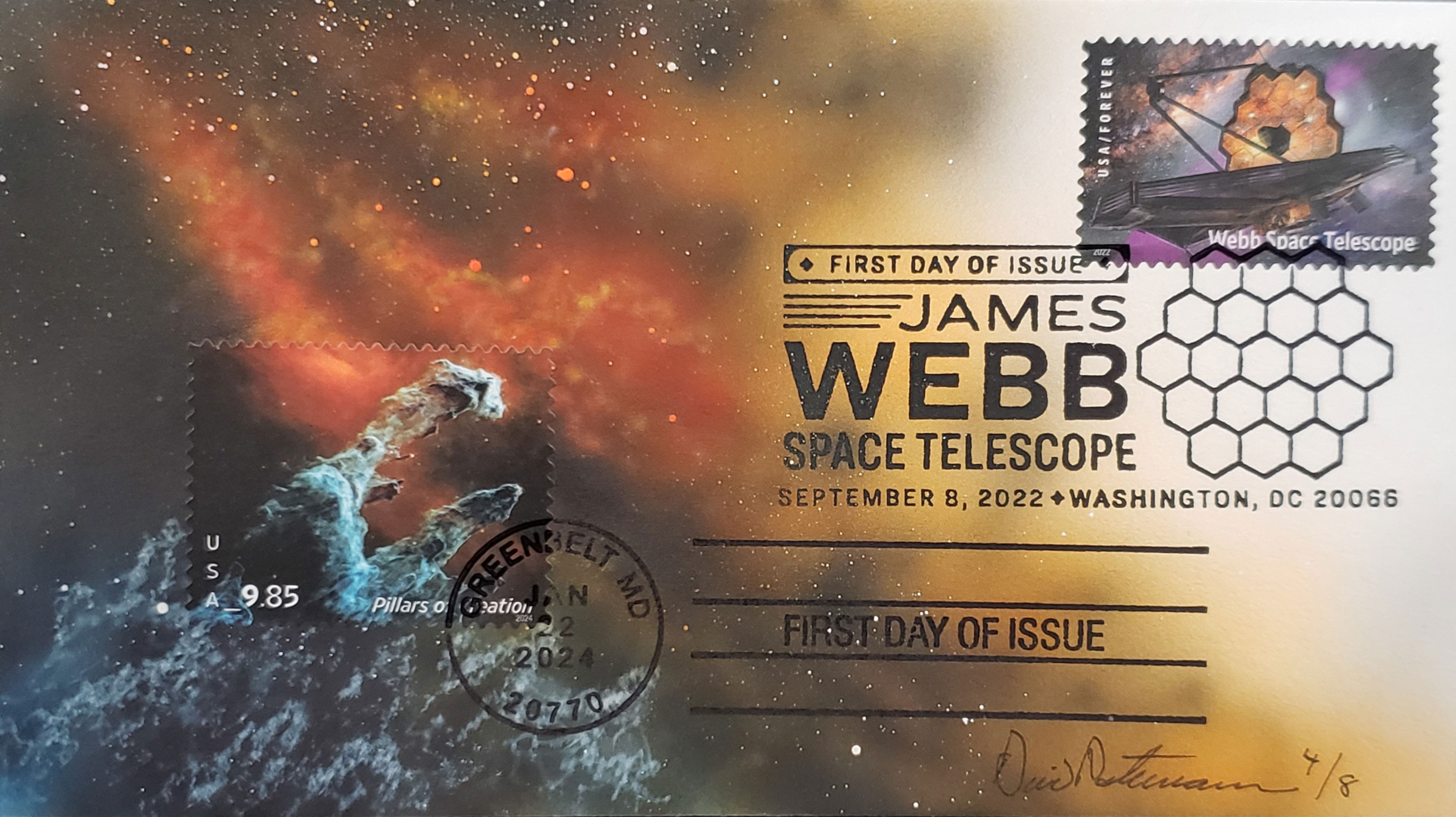 The fourth cover is an example of where the artist incorporated the stamp into the cachet. This is a dual First Day Cover for the release of the James Webb Space Telescope stamp and the 'Pillars of Creation' stamp. The Pillars of Creation are clouds of gas and dust stretching several light-years within the Eagle Nebula. Their shapes are created by strong stellar winds and high-energy radiation from hot, newly formed stars in star cluster NGC 6611, which lies at the center of the nebula.