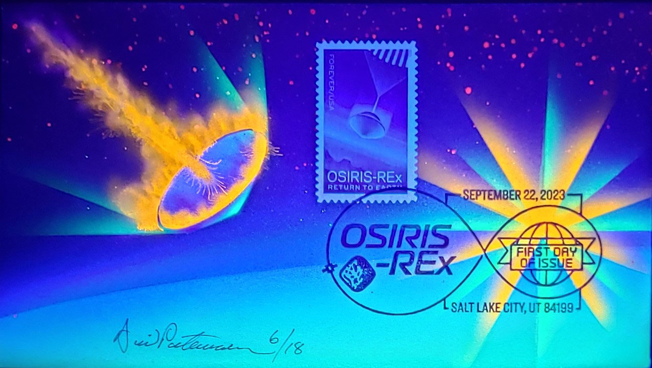 The last cover is, perhaps, one of the most unique hand-painted covers made. It is a First Day Cover for the release of the OSIRIS REx stamp. OSIRIS-REx was a NASA asteroid-study and sample-return mission that visited and collected samples from 101955 Bennu, a carbonaceous near-Earth asteroid. The material was returned in September 2023.
