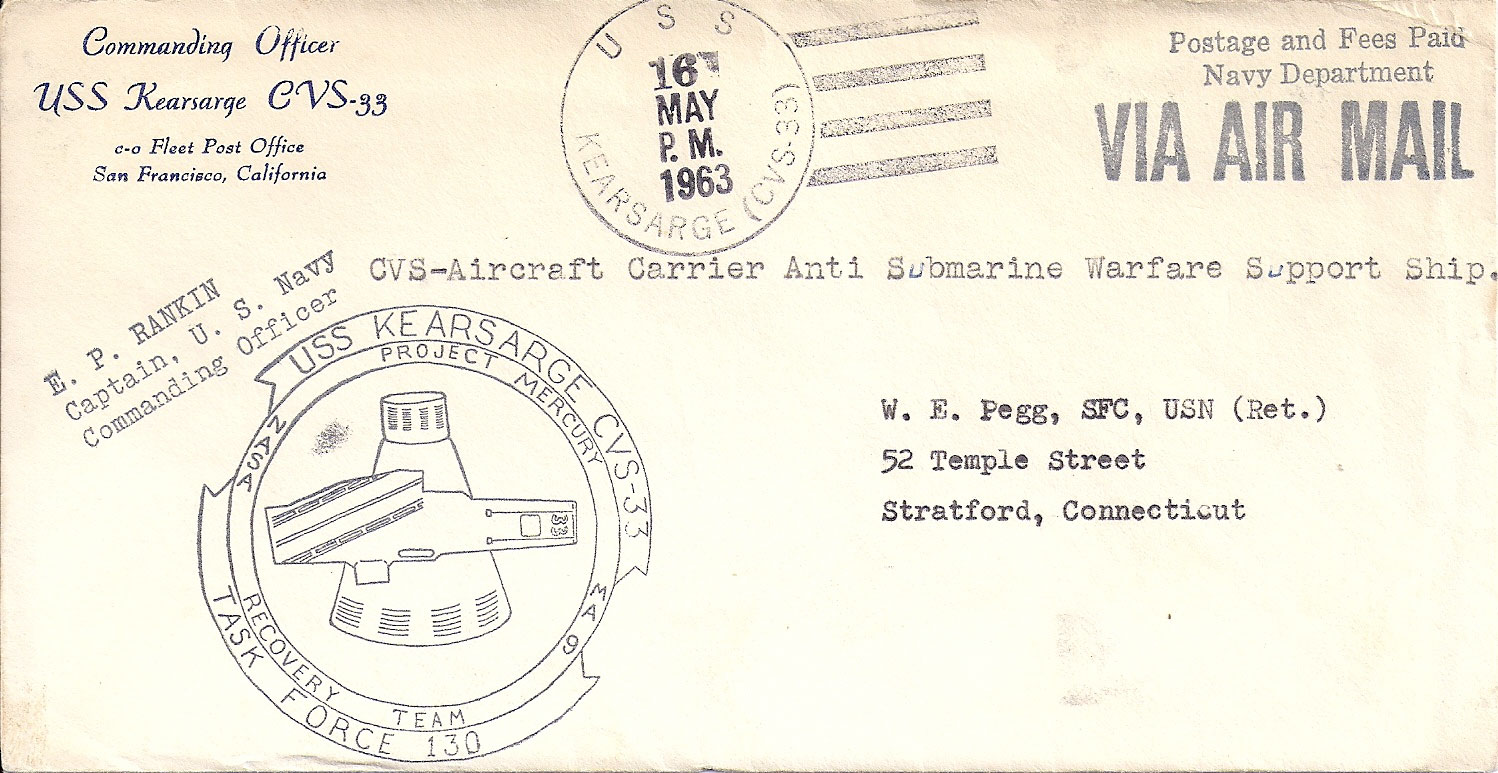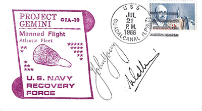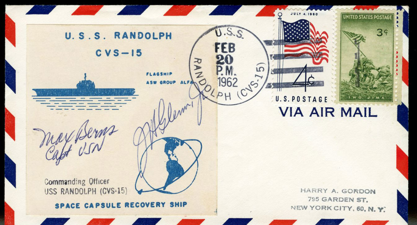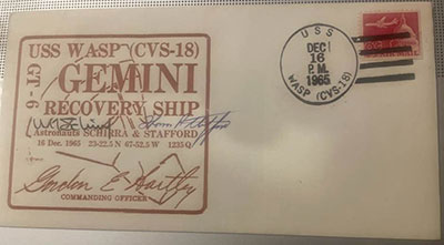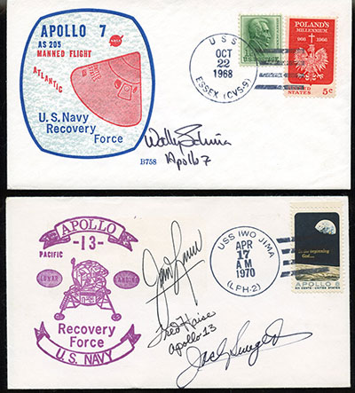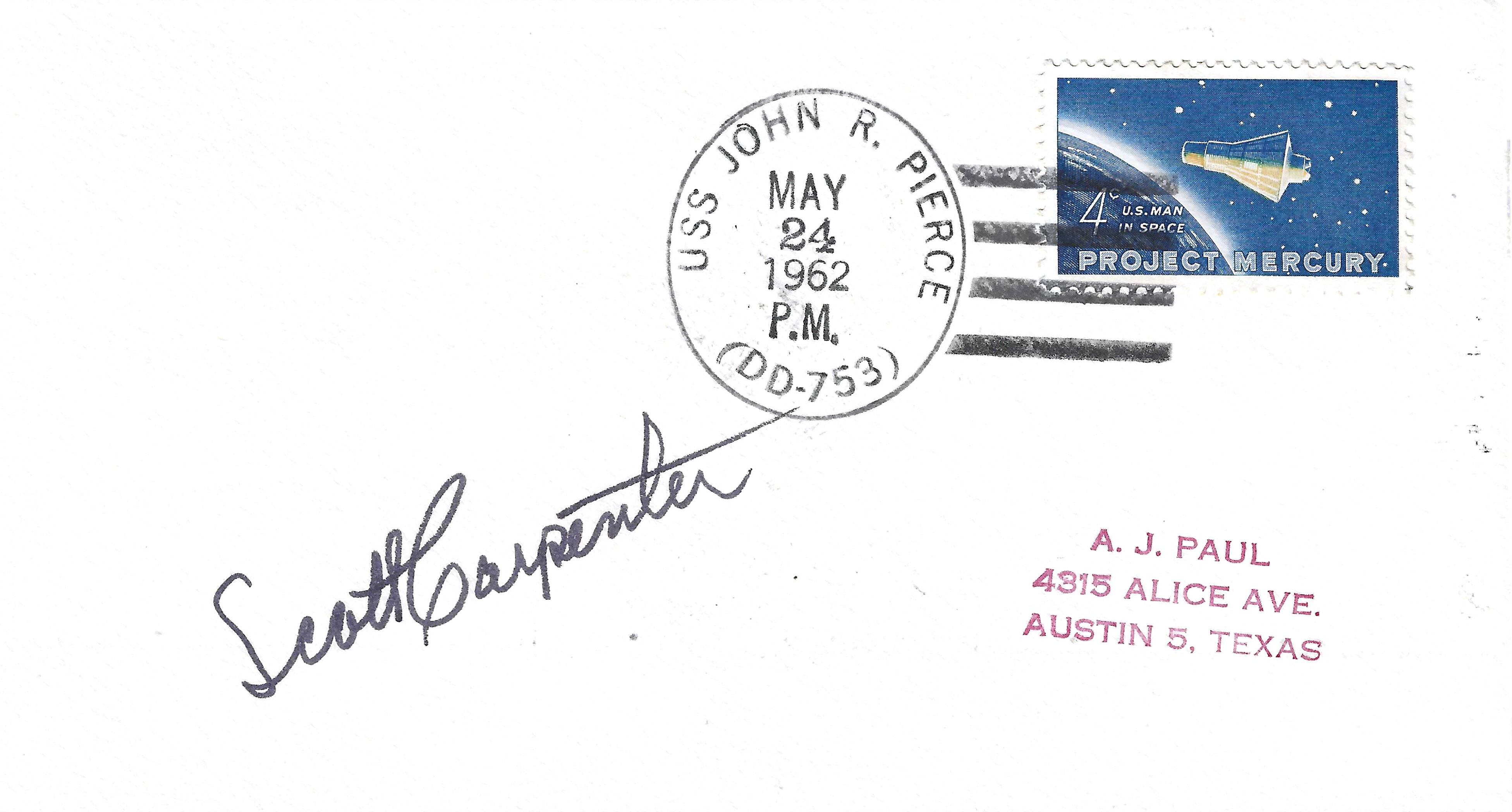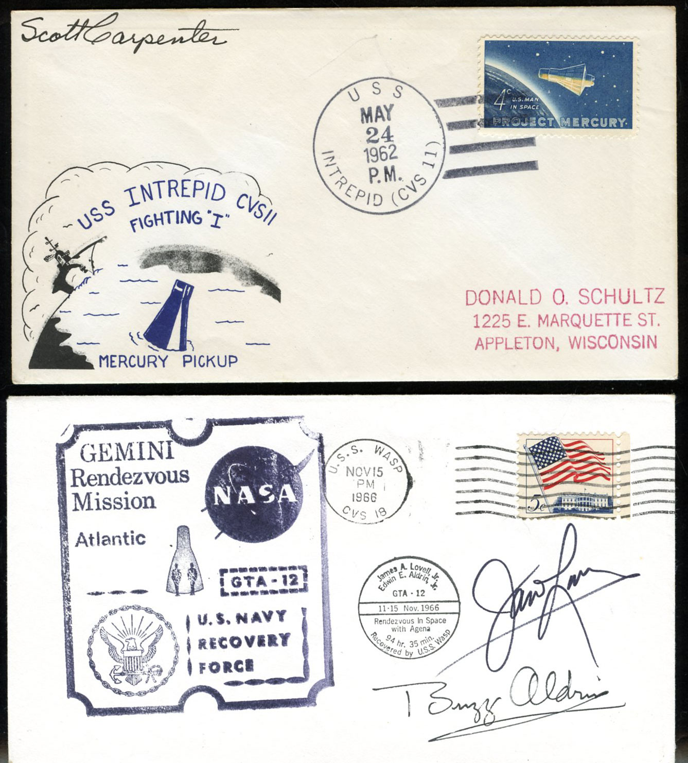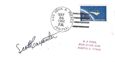 Great topic Bob. Prime Recovery Ship (PRS) covers are one of my favorite topics to collect. I have PRS covers, both Printed Beck and RSC, for every Mercury, Gemini, Apollo, Skylab and ASTP mission and crew-signed PRS covers for all of these missions except Geminis 3 and 8 and Apollos 8 and 11, including an Alan Shepard signed USS Lake Champlain cover for the recovery of MR-3.I recently moved, and most of my covers are still in boxes. However I was able to find a few crew-signed PRS covers, such as a scarce USS Pierce cover (with the ship’s RSC on the back) signed by Scott Carpenter. Although the USS Pierce was not the PRS for MA-7 it did recover the Aurora 7 spacecraft and, along with the USS Intrepid cover that Bob shows in his posting, is highly sought after by PRS cover collectors looking to complete their PRS collection. The USS Pierce/USS Intrepid covers for MA-7 are similar to the USS Randolph/USS Noa covers for MA-6 in that both ships had ‘primary-type’ roles in recovering the astronaut and the spacecraft.  I also located crew-signed covers for Gemini 10, Apollo 10 and Apollo 13. All of these covers are in mint condition with great cancellations, cachets and signatures, especially the crew-signed Apollo 13 cover that also has the signatures of the Commanding Officer of the USS Iwo Jima and the pilot of the helicopter that recovered the crew.