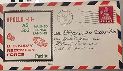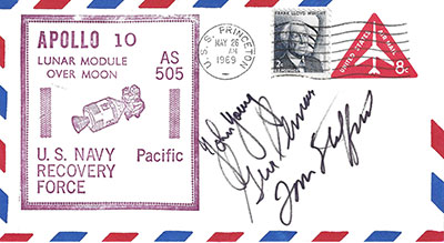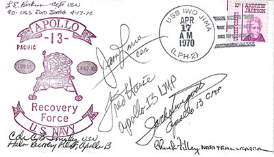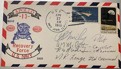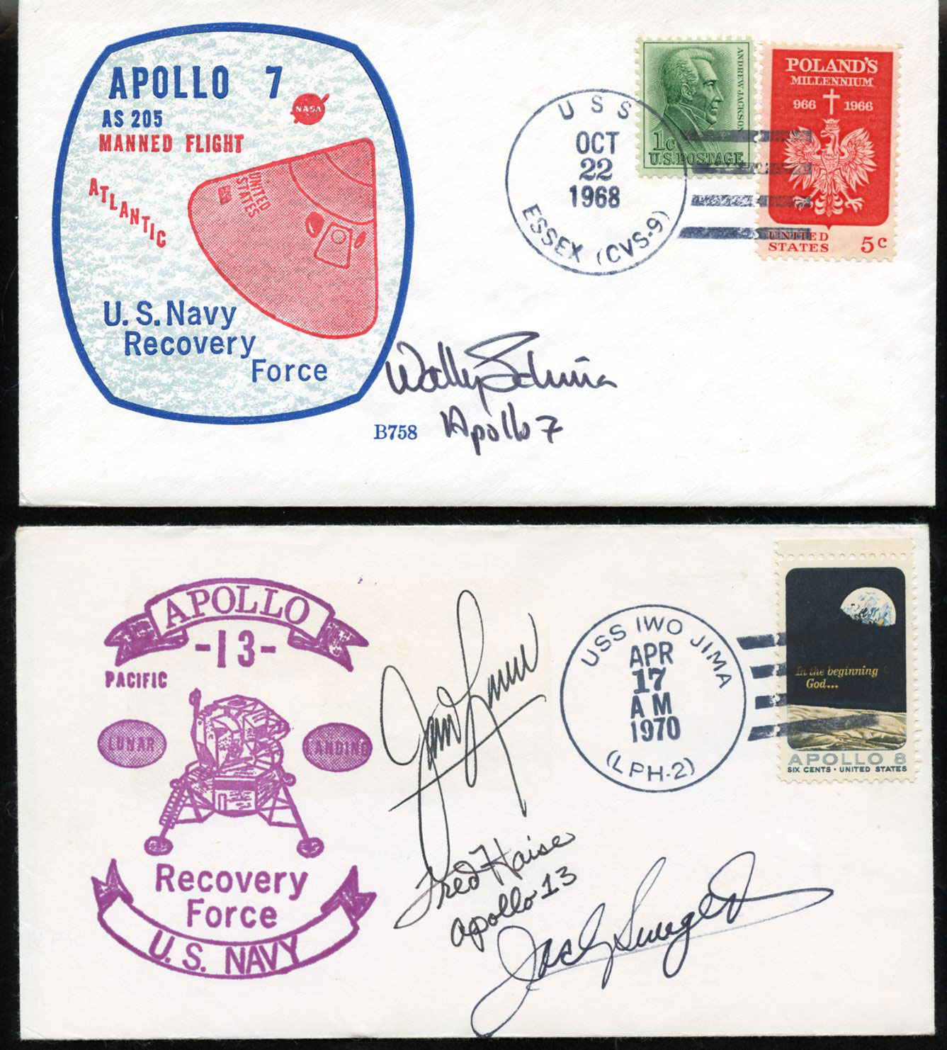 Space Cover of the Week, Week 841 (January 18, 2026) Space Cover 841: My Favorite Prime Recovery Ship CoversMy Prime Recovery Ship (PRS) cover collection pales in comparison to those of many others here, but I only needed a limited number of PRS covers for my crew signed cover collection. The ones shown here are my favorites and two or three are of special note. This Mercury-Atlas 6 PRS cover, autographed by John Glenn and the ship's captain, is unusual in that it has no glue stains on the adhesive label as is typical with these covers. This came from a Space Unit auction in 1986 for $110 and is from the collection of pioneer collector Harry Gordon.  The Mercury-Atlas 7 PRS cover is also of special note because of several factors: it's a printed cachet Captain's Cover; it originated from another pioneer collector, Donald Schultz; it has an excellent cancel and appropriate Mercury stamp; and is autographed by Scott Carpenter. This is almost identical to the one pictured on page 46 in Schultz's excellent "Project Mercury...One Step Into Space" booklet. This Gemini-Titan 12 PRS cover serves as an great example of a PRS cover, having an appropriate US flag stamp with a clear USS Wasp machine cancel; well-applied GT-12 PRS rubber stamp cachet; a small Beck circular stamp; and nicely signed by the crew of Lovell and Aldrin.  I have very few Beck printed cachet covers and this is my favorite. Besides exhibiting an excellent Wally Schirra autograph and inscription, this Apollo 7 PRS cover has the added features of a handsome Beck multi-colored Apollo 7 US Navy Recovery Force printed cachet, a well-applied USS Essex hand stamp cancel and a colorful pair of stamps. This Apollo 13 USS Iwo Jima PRS cover serves as an ideal example of an Apollo PRS cover: It has an appropriate Apollo 8 stamp; canceled with a well-applied USS Iwo Jima hand stamp cancel; the US Navy Recovery Force rubber stamp cachet is perfectly applied; and was autographed well by the crew of Lovell, Haise and Swigert. I do regret that I didn't pursue PRS covers better, but am happy with those I have. Others here have exceptional PRS cover collections. |