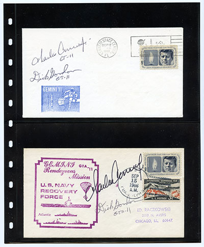 Sounds almost impossible? Well, not quite impossible because those crew signed covers all surely exist, but many are stashed away in permanent collections, so finding any available and affording them would make that supreme quest close to only a dream for almost all serious collectors. Does such a set even exist?!Located in two SAFE First Day Cover albums, I have my launch/PRS crew signed covers housed in pairs, but far from complete. A page for GT-11 from that collection is shown here as an example and to show how one collector displays his far-from-complete launch/PRS crew signed cover collection (with unsigned covers to fill in most of the gaps) - with a launch cover at the top and a PRS cover below from MR-3 to ASTP.  |