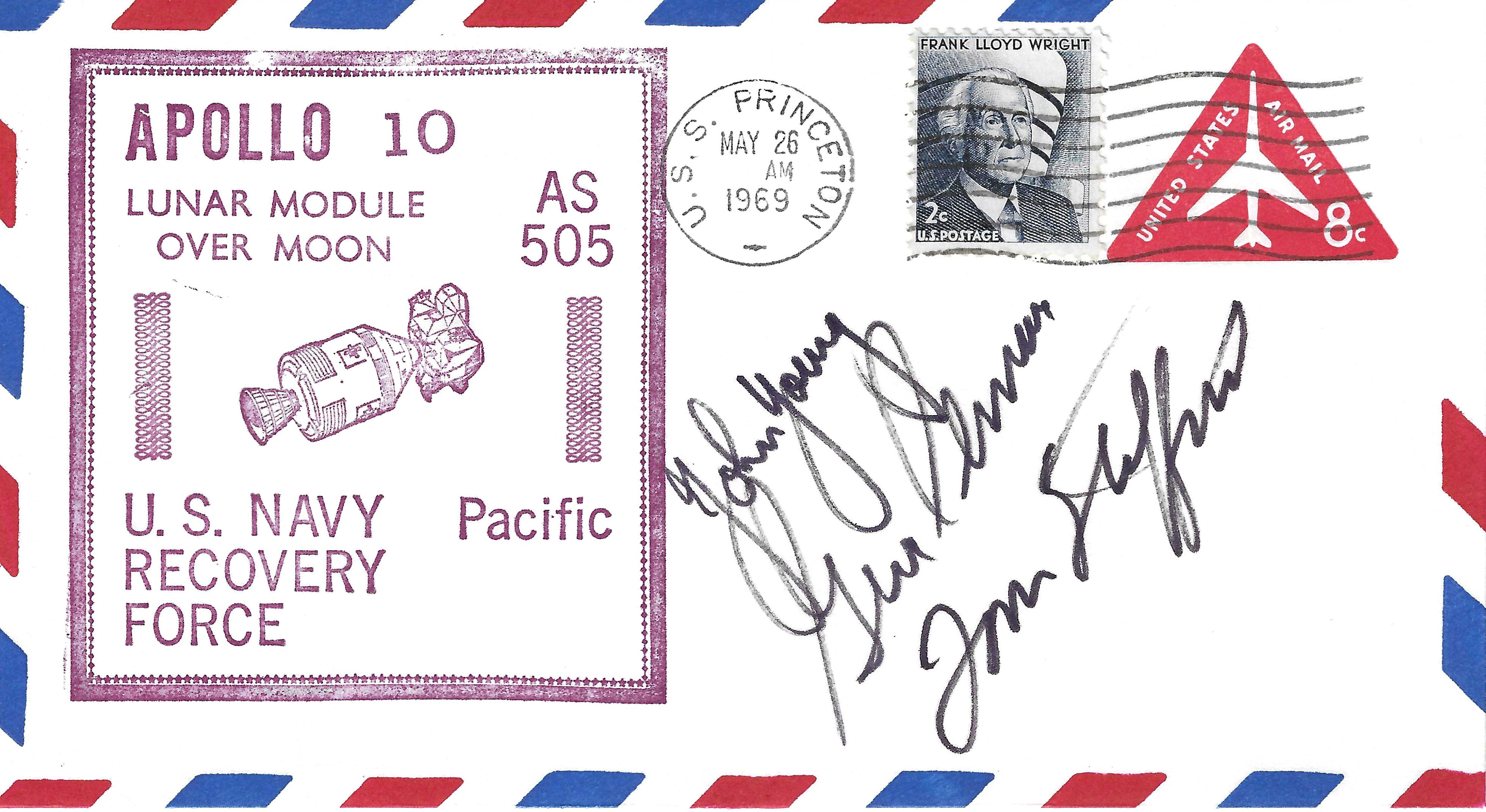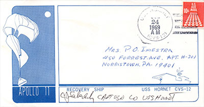 Here are a couple of my fave PRS covers: Above is the Captain's Cover for Gordon Cooper's MA-9 flight. These are incredibly hard to find, and I feel lucky to have had this practically dropped in my lap. Steve Durst and I were at Ed Bizub's (Eddie's dad) house 25ish years ago and Ed offered this to us. Steve passed on buying it, so yours truly grabbed it in a heartbeat.  And here is an Apollo 11 Captain's Cover autographed by C.J. Seiberlich, the Captain of the Hornet for the Apollo 11 (and 12) recovery. Seiberlich spoke at a Space Unit get-together at a stamp show 20-25 years ago and graciously signed this. My favorite story that Seiberlich told involved President Nixon coming to the Hornet for the recovery. Remember on the early moon landings, there were precautions in case the crew may have brought some moon-germs back with them? Well, Seiberlich and his crew had to work hard to choreograph where the President was on the ship at all times, versus which way the wind was coming from, and which way the ship was sailing to always keep the President upwind of the Apollo 11 crew and capsule. It would have been a bad day if the President had inhaled some moon bugs...  |