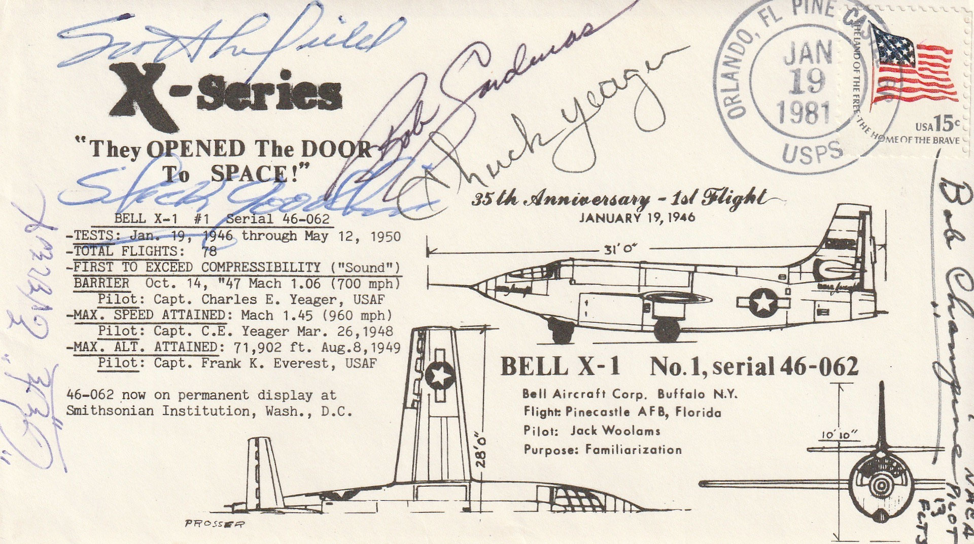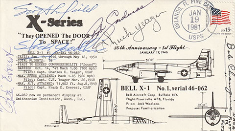 Excellent X-1 Pine Castle anniversary cover, Dennis, with autographs of 5 of the 18 Bell X-1 pilots.Dennis provided very interesting information about the X-1 at Pine Castle and not being familiar with the ill-fated Jack Woolams, I looked for further information about him. He was Bell Aircraft's chief pilot and, as one source mentioned, would have been seriously considered to have piloted the first flight to exceed the speed of sound instead of Chuck Yeager. Woolams was killed in a race-configured P-39, named Cobra I, while practicing for the Cleveland Air Races and its 1946 Thompson Trophy Race award. Woolman's partner, Alvin "Tex" Johnston, then flying Cobra II, won the race and gave one-half of his $19,400 winnings to Woolman's widow. By dying so early in the X-1 Program, Woolams' autograph is among the rarest of the 18 X-1 pilots' autographs and his and 3-4 other X-1 pilots' autographs make a complete 18 X-1 pilot autograph set unattainable by us present-day collectors; work on a moonwalker or X-15 set instead. | |