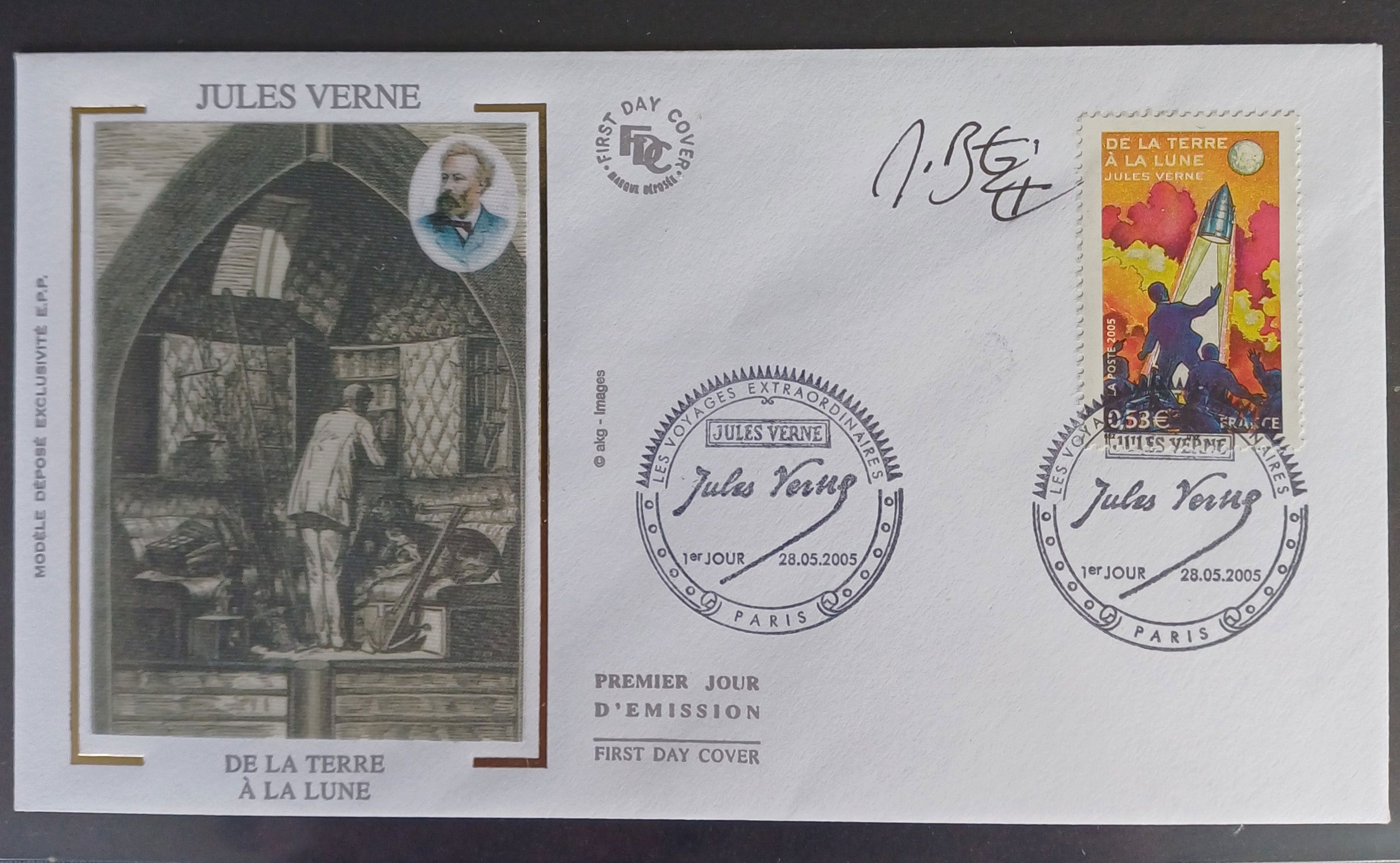 Pictured above are my two covers. The first is a French FDC of a stamp celebrating the birth of Georges Méliès the filmmaker who created his movie Le Voyage dans la Lune which was released in 1902. He was born 8th December 1861, whereas the stamp was released on 11th March 1961. The second is another French FDC, this one commemorating the death of Jules Verne whose book De la Terre à la Lune was published in 1865. He died on 24th March 1905, whereas the stamp was issued on 28th May 2005. (The cover is signed by the stamp designer artist). I have an 125th anniversary of Konstantin Tsiolkovsky's birthday, but have yet to acquire a centennial cover. Similarly I have a 75th anniversary cover of Sergei Korolev's birth, and I'm also yet to find a centennial cover. Does anybody have any other centennial space covers? If so please show them. |