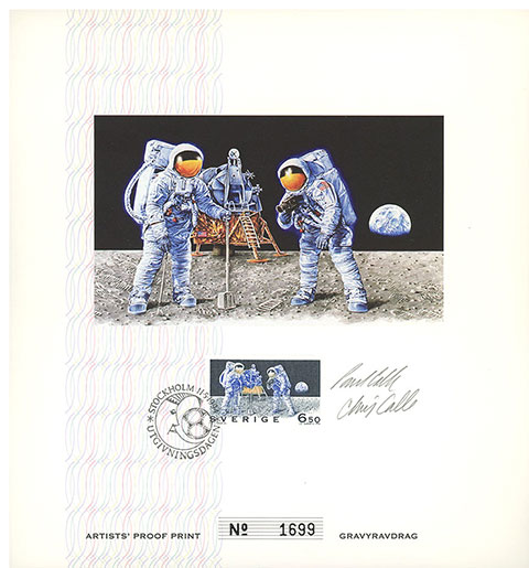 In addition to the stamp being issued in Sweden a proofcard/limited edtion print was produced of which only three are signed by Paul Calle and Chris Calle as stamp designers, and Czeslaw Slania as engraver.