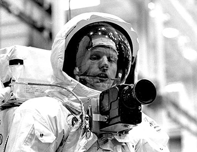 Apollo 11 astronaut Neil Armstrong training for the moon landing seen here with the Hasselblad camera mounted on the front of his spacesuit.