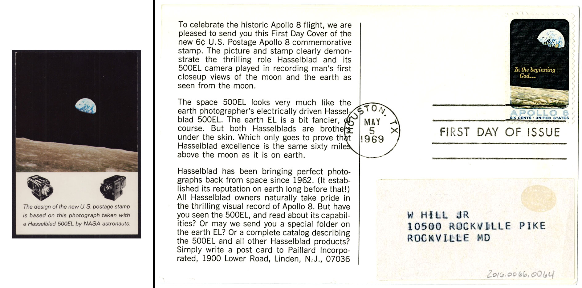 The breathtaking image of Earthrise taken with a Hasselblad camera by Apollo 8 astronaut Bill Anders was later memorialized on a United States postage stamp, Scott #1371.