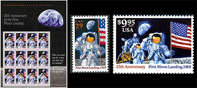 Leading up to the 25th anniversary of Apollo 11 I was working on several illustration projects when the United States Postal Service asked me and my father Paul Calle to jointly design an Express Mail postage stamp commemorating the Anniversary of the First Moon Landing. That stamp design assignment became two separate stamps, the Express Mail stamp (Scott #2478) and a 29 cent commemorative stamp (Scott # 2841). That design process for those stamps I'll save for another Space Cover of the Week.