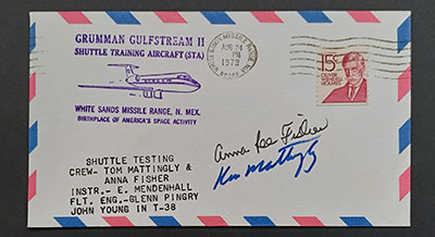 I only have one cover in my collection that fits into this topic. It actually lies well outside the mainstream of my collection as I do not collect the space shuttle era, but it was one of my first covers I acquired with an Apollo astronauts signature and although I have since purchased other, more relevant, Ken Mattingly signed covers I decided to keep this one.Although my cover was not flown on the training flight, I think it can be incorporated not only into SCOTW 847, as Anna Lee Fisher was definitely a pre-flight astronaut on this training flight, but would also slot right in to the SCOTW 190 mentioned by Bob, as Ken Mattingly was an active astronaut on this training flight. Also, although he did not sign it, John Young was on this training mission flying the T-38 escort.  The cover celebrates a Grumman Gulfstream 2 Shuttle Training Aircraft flight on 24th August 1978 from White Sands. The Grumman Gulfstream 2 was designed to replicate the glide parameters of an incoming space shuttle. This training flight occupies a place in the three astronauts' careers as marked by the asterisks below. - John Young - selected with Group 2 (the Next Nine) in September 1962; flew on Gemini 3 in March 1965; flew on Gemini 10 in July 1966; flew on Apollo 10 in May 1969; walked on the moon Apollo 16 in April 1972; * training ; flew on STS-1 in April 1981; flew on STS-9 in November 1983.
