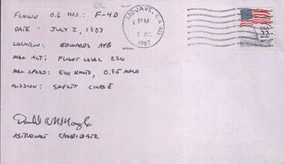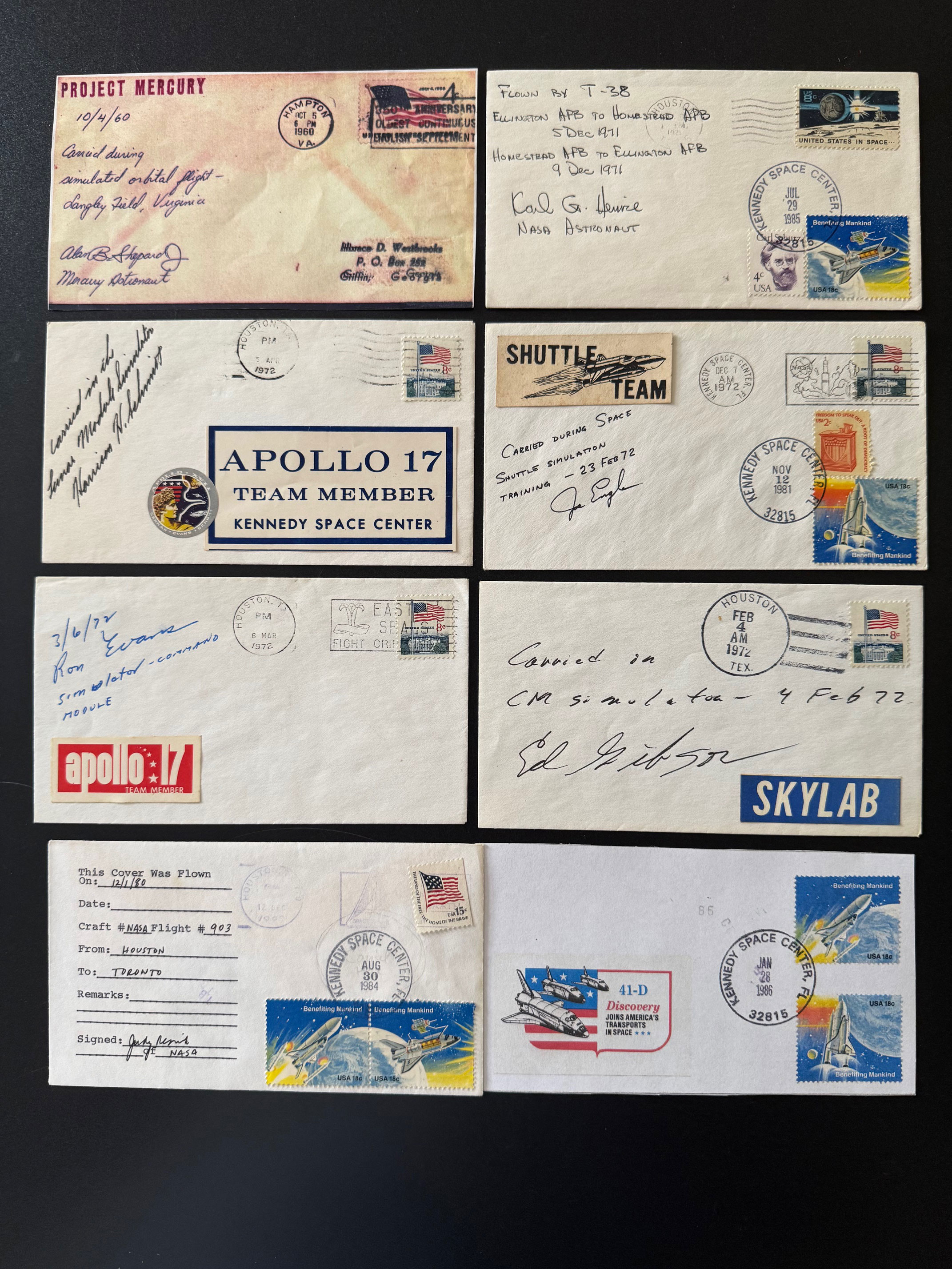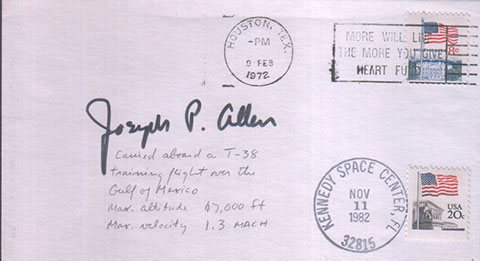 Thanks for sharing Jeff and the illustrated Joe Allen flight cover reminds me of what a small world astrophilately can be among us collectors. Believe it or not, I actually affixed the postage flag stamp at cover's bottom right for Allen's first Shuttle flight (STS-5/Columbia). The hand cancel was applied by my own hand at KSC in Nov. 1982. Now how weird is that? A few more earlier astronaut training covers that were carried or flown as displayed above. The first at top left is a Shepard signed and notated Project Mercury procedures simulator carried cover in preparation for MR-3 in Oct. 1960, just over seven months before he became the first American in space. Other covers included are by Karl Henize in a T-38 jet aircraft flight in 1971, a Lunar Module simulator at MSC/JSC signed by Harrison H. Schmitt in 1972 before the final Apollo lunar landing mission, and one of the first Space Shuttle simulation trainings by Joe Engle in Feb. 1972, nearly a decade before the first shuttle orbital flight took place. There are many others to show, but most of those from other Apollo and Skylab astronauts contained only a few words or a sentence or two of their carried or flight training status. Those shown for now are of Ron Evans for Apollo 17 training and Ed Gibson for early Skylab in 1972. The bottom cover, with only a few written words, was done by early shuttle astronaut Judy Resnik in Dec. 1980 when she flew a NASA T-38 aircraft from Houston to Toronto possibly for a Canadian RMS training visit. What perhaps makes this flown cover more unusual is that both cover sides have appropriate postal markings and an affixed decal sticker for Resnik's first shuttle flight (41-D) and her last with Mission 51-L that took her life. | |