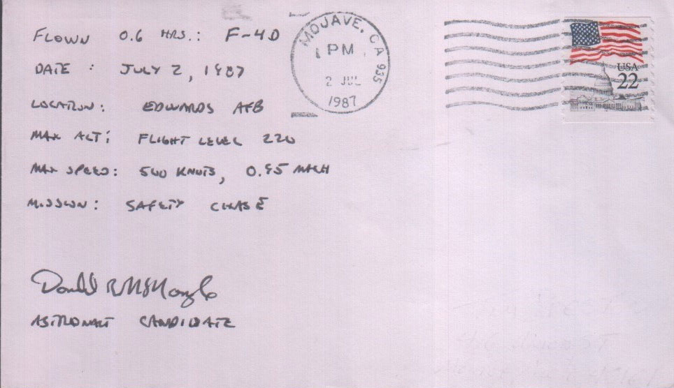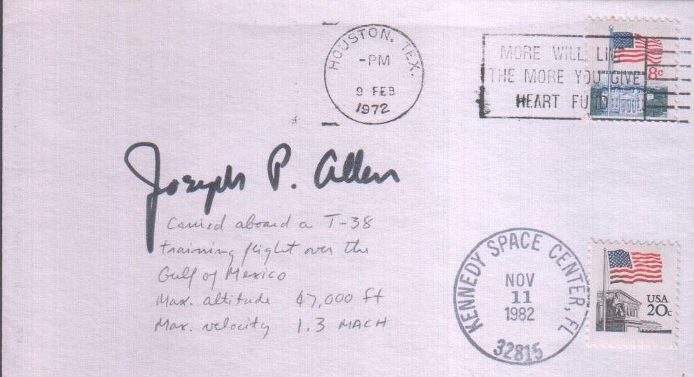 Space Cover of the Week, Week 847 (March 1, 2026) Space Cover 847: Astronaut Training FlightsThe space cover this week celebrates the pre-flight training astronauts and astronaut candidates embark on prior to launching into space for the first time. The cover is machine cancelled on February 9th, 1972 in Houston, Texas and has a hand-written flight details, signed by Joeseph P. Allen. Allen was selected in 1967 as part of Group 6, the XS-11 (Excess Eleven), the astronaut class famous for having been told by then chief of the astronaut office Deke Slayton, "we don't need you around here." Those that remained were given ground assignments due to lack of space flight opportunities resulting from the cancellation of the later Apollo flights. Allen stuck around and in 1972 was flying a T-38 over the Gulf of Mexico as the cover this week represents. From this flight, he would still wait 10 more years to fly in space for the first time on STS-5, the first operational mission of the Space Shuttle. The SCOTW is also postmarked on November 11, 1982 the STS-5 launch date on Columbia from Kennedy Space Center, Florida, a nice bookend to the story. Ultimately seven of the original XS-11 members flew in space a total of 15 times, including Story Musgrave the only astronaut to have flown on all five Space Shuttles. A testament to the work and dedication these astronauts put into the space program. I've included a few other training flight covers from my collection below, they can be found from many different astronauts, aircraft, and locations. Whether carried on the flight or not, these are great additions for any collection wishing to document the astronaut classes and the candidates selected. The dates of the flight themselves typically aren't the most interesting thing about these covers, instead the aircraft type, origin and destination can provide some insight into the astronauts' life prior to their first mission.  Donald McMonagle was part of Group 12 (The GAFFers), this training flight at Edwards AFB, California on July 2, 1987 was one month after his selection. He would first fly in space on STS-39 in 1991.