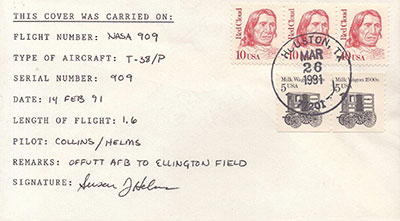 Nice covers. I have many covers for astronaut training flights, mainly Shuttle-related and unsigned. The Collins/Helms cover is especially notable, with Collins of course being the first female Shuttle pilot and commander, and first US woman to command a spaceflight. Helms is the highest-ranking female military astronaut, attaining three-star Lt. Gen. rank in the USAF. |