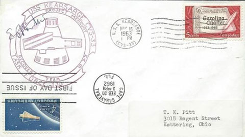 The first cover is a First Day Cover (FDC) for Project Mercury that was also cancelled for the recovery of Gordon Cooper during the MA-9 mission with the ship's RSC. What makes this PRS cover 'unique' is that not only is the cover a FDC for the Project Mercury stamp and a PRS cover for MA-9 but it also commemorates both the conclusion of the first manned Mercury orbital mission (MA-6 with John Glenn) and the last manned Mercury mission (MA-9 with Gordon Cooper). Although there may be other covers with this dual cancel this is the only one I've seen.