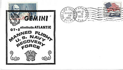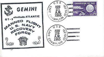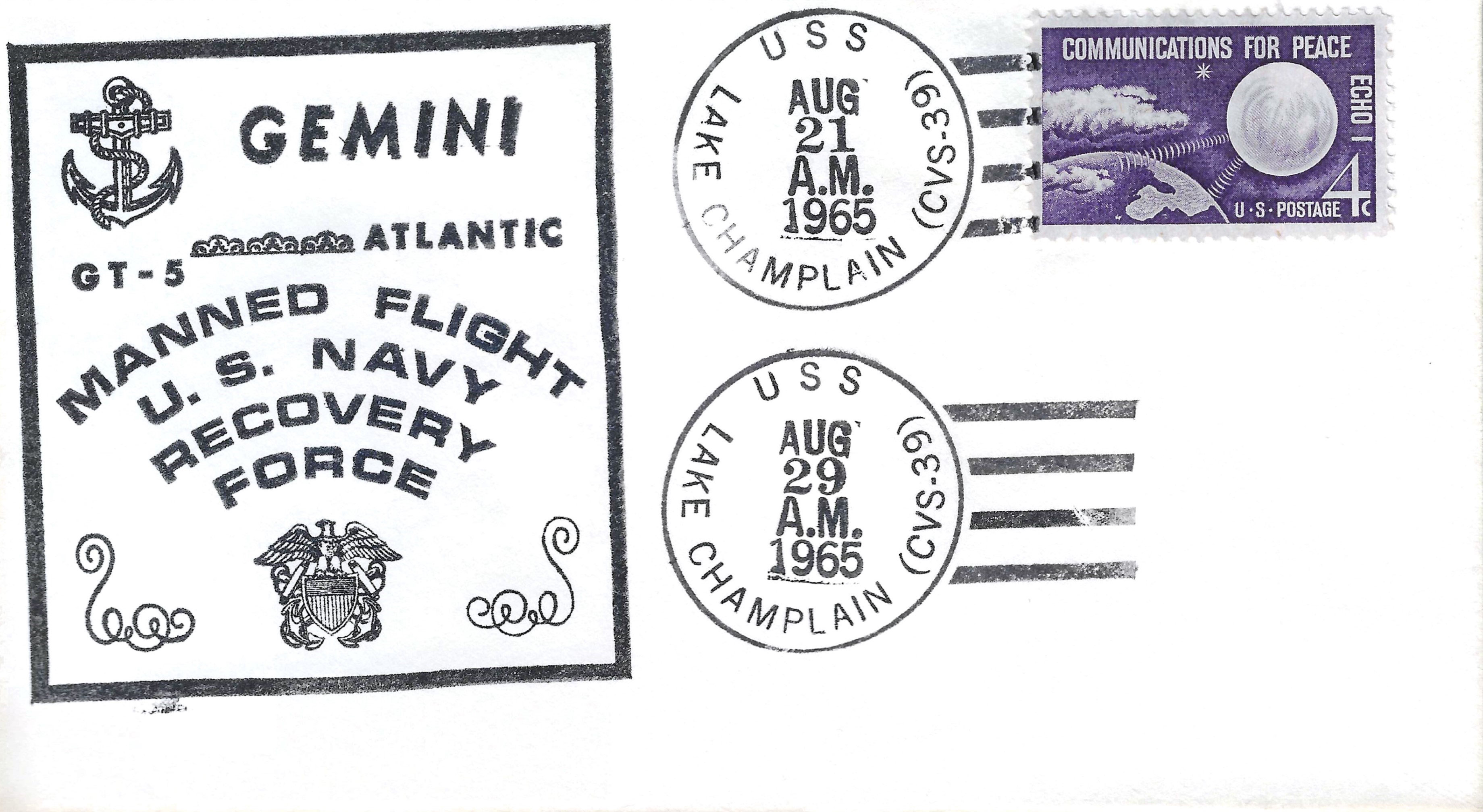 The third cover is also a GT-5 cover from the USS Lake Champlain with a Beck RSC, but this one is cancelled for both the launch of GT-5 on August 21, 1965 and the recovery on August 29, 1965. What makes this cover 'unique' is that it's a PRS cover that was cancelled for both the launch and recovery of a mission.