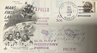 The last cover was cancelled for the recovery of the Apollo 11 crew by the USS Hornet on July 24, 1969. What makes this cover 'unique' is that the cover used was made by Art Craft for the First Day of Issue of the First Man on the Moon stamp on September 9, 1969. I don't know when these covers were first available so either they were available before July 24, 1969 or this cover was backdated. If anyone knows the history of this cover please let me know.