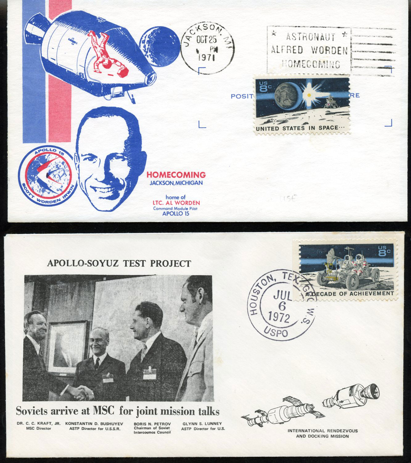 Above at the top is an excellent cover honoring Al Worden with a special homecoming slogan cancel after his Apollo 15 flight (would have been great to have been autographed by him). Below is a cover from the Manned Spacecraft Center Cover Society that is for the Soviet officials' arrival in Houston for joint ASTP mission talks.