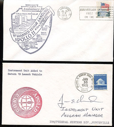 Apollo 11 anniversary covers were created and continued for many years, with this one for Apollo 11's 4th anniversary. The Instrument Unit was added to the ASTP Saturn 1B launch vehicle and this cover for that event was later signed by the IU Program Manager.