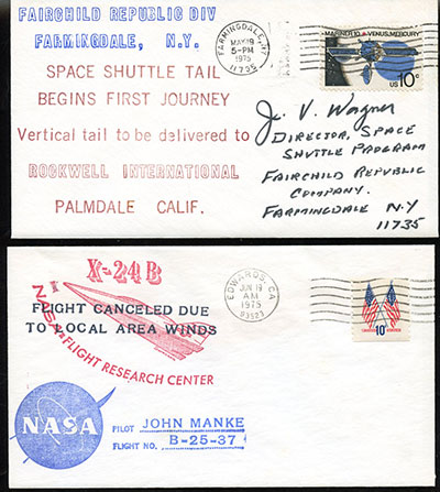 The top cover came from prolific space cover producer/dealer Sean Marsar and marks the departure of the first orbiter's vertical tail from its builder in Farmington, NY to the assembly plant in Palmdale, CA, and was later signed by the director in charge. Being an X-24B Lifting Body enthusiast, I couldn't resist this cover marking the cancelation of a planned flight at Edwards.