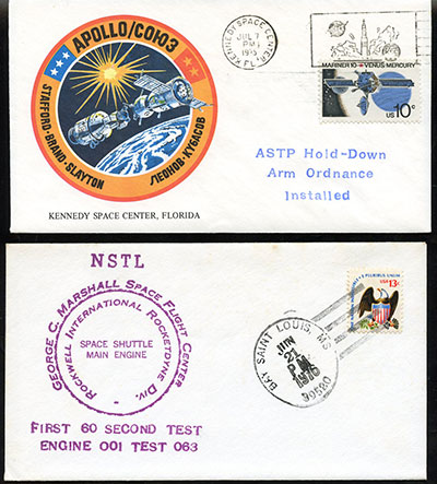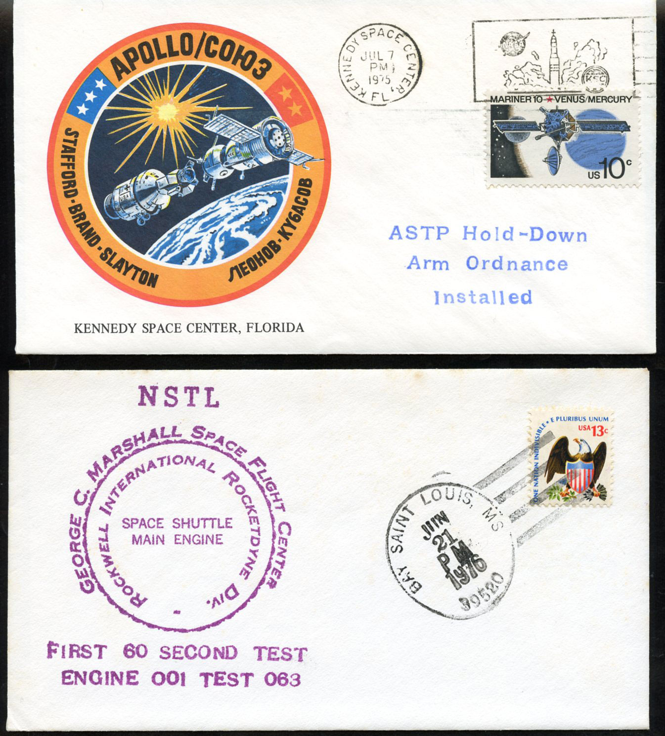 This ASTP emblem cover was canceled for the installation of the hold-down arm ordnance on the pad and is a good example of the many great covers Ken Havekotte created for us collectors. This 2nd cover was canceled for one of many Space Shuttle Main Engine test firings at NSTL at Bay Saint Louis, MS.