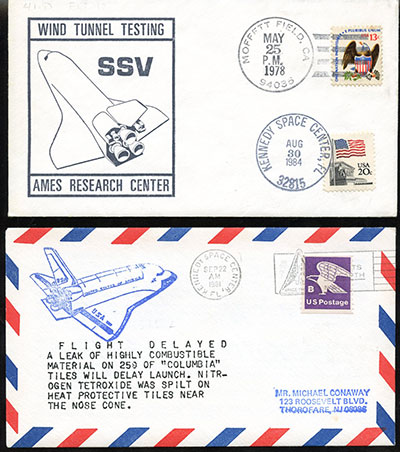 This is one of four different cachets that the Ames Research Center Stamp Club applied to collector covers for Space Shuttle wind tunnel tests (later also canceled for the 41-D launch). This 2nd cover was a production of another prolific space cover producer/dealer, Robert Boudwin. It marks an STS-2 launch delay/scrub.