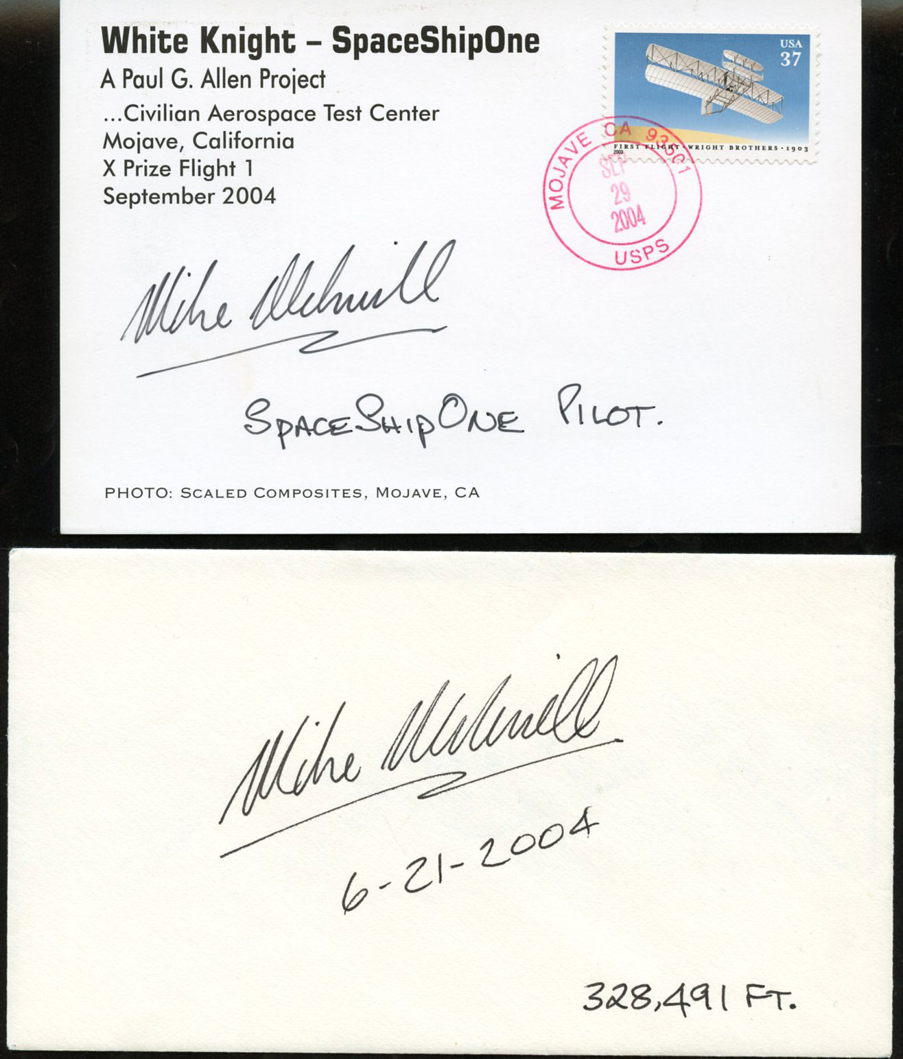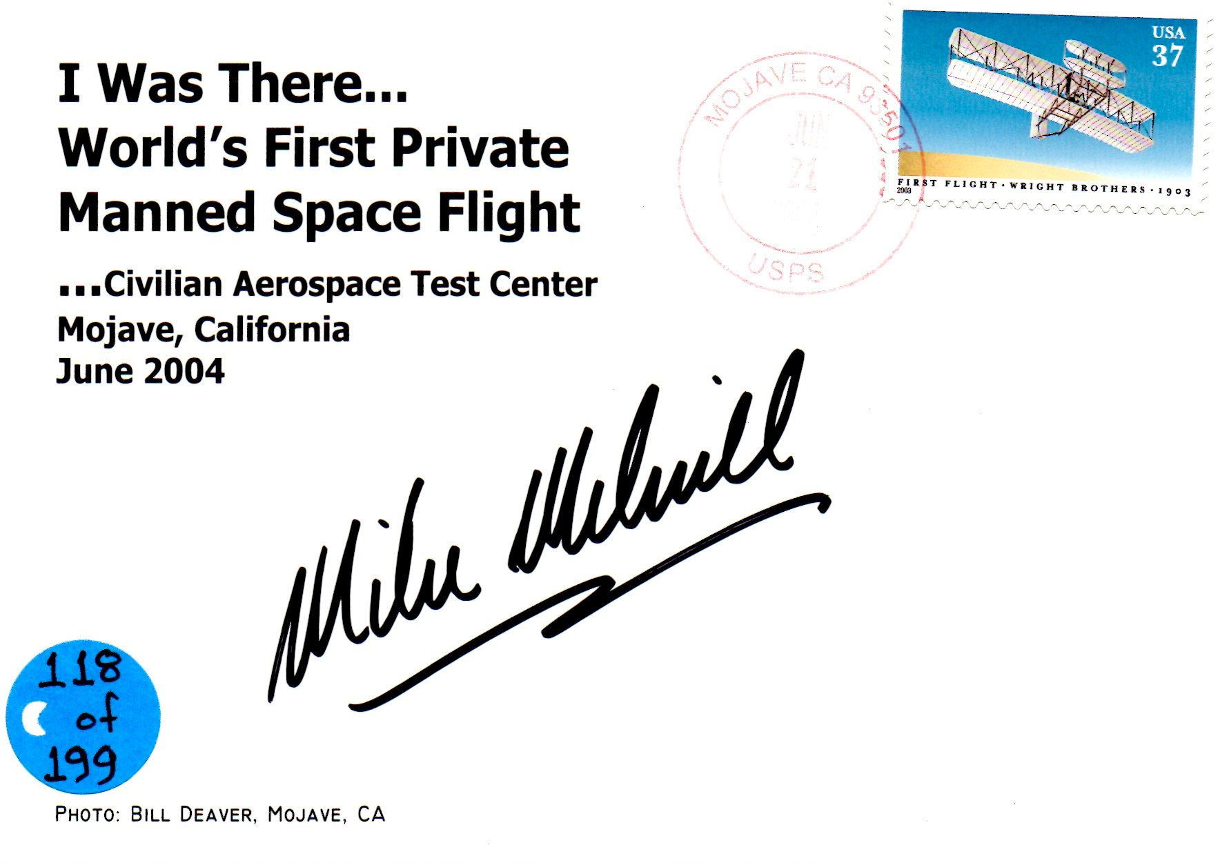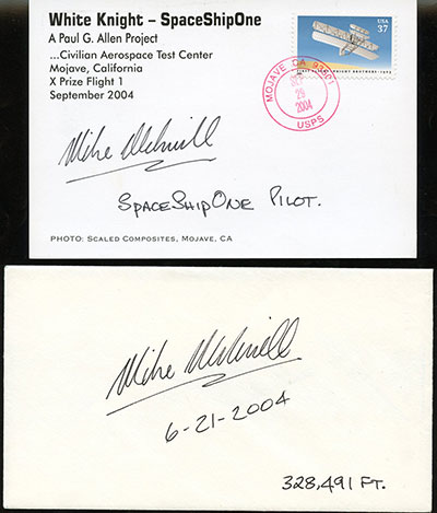 Space Cover 850: Remembering Mike MelvillMike Melvill, the first commercial astronaut, passed away just a few days ago on March 19, 2026. The postcard above was postmarked at Mojave, CA on the day that he first flew into space, June 21, 2004, flying SpaceShipOne (SS1). The card was later autographed by Melvill and flown on the final SS1 spaceflight on October 4, 2004 (in the hands of pilot Brian Binnie). A set of three of these cards were sold by Tonya Rutan (wife of Scaled Composites designer Burt Rutan) for $75 after that third and final spaceflight on Oct 4. This one is #118 of the 199 flown.
