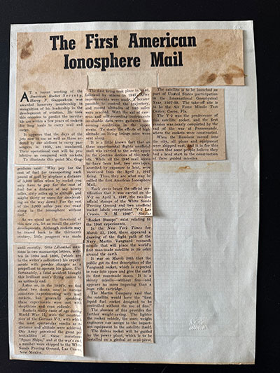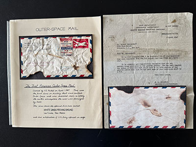 Finally at last one of two historic covers have surfaced this month relating to the early missile and rocket development era of post-world war 1940's. It would be nearly eight decades that such a "holy grail" cover would come to light. After receiving an exciting email by a Swiss philatelic expert early this month, it became possible in having an opportunity to acquire one of those elusive flown V-2 airmail covers without being in an auction. It was for V-2 Flight #22 that flew from the old White Sands Proving Ground (WSPG), New Mexico, on April 1, 1947 (See Space Cover of the Week 39). For now, to make a long story short, the flown V-2 cover is only one of two that became the first rocket mail to reach outer space. Aviation pioneer Harry Guggenheim, a distinguished American that provided research grants to U.S. rocket pioneer Robert Goddard, said during a meeting of the American Rocket Society in 1956 that he supported this advanced new era of rocket mail possibilities, of which, never came to be. The article in Stamps Magazine goes on to verify that the same two covers were indeed the first ionosphere mail to reach outer space. As to the captured German-made V-2 rockets by the Soviets after World War II, the Russians did not start test flying V-2's until October 1947. So the Americans were the first to actually reach outer space six months before. The ionosphere, located about 30 to 600+ miles above the earth's surface, is an ionized part of the upper atmosphere that serves as a boundary between earth's neutral atmosphere and space itself.  As reported earlier, some V-2 rocket mail did fly in October 1946 from White Sands. They never survived the rigors of supersonic rocket travel when being destroyed by an intense fiery explosion from a hard nose-dive landing in the Chilhuahuan Desert of southern New Mexico. V-2 rocket flight #22 with two mail covers aboard was a nominal flight reaching just over 80 miles high with a range of 24 miles. Engine burn time was almost a minute into the flight. Once reaching a speed of over March 4, it became like a suborbital ballistic missile, as it starts its return back to earth. Right before impact, the rocket's speed had been significantly slower, but still supersonic at 1,800 mph when it hit the desert ground falling back from space. When the twin covers were located in the rocket's instrumentation or equipment bay of the nose cone area after flight, they both had been damaged and engulfed by impact heat exposure. But amazingly enough, when recovered, both covers did survive with some scorched heat markings and burned-off envelope cover edges. To help more with their authenticity, note the letter mailed to avid rocket mail collector Robert Schoendorf of Glendale, Long Island, New York. It was sent from the War Department's Ordnance division at WSPG at Las Cruces, NM, on April 2, 1947. The typewritten letter, believed to be an original, was addressed to Schoendorf with the following text: It is with pleasure that I am inclosing two of your envelopes that were recovered from the V-2 rocket that was fired on 1 April 1947. It is urgently and respectfully requested that you not exhibit these envelopes to the general public. You can well imagine the deluge of requests that would poor into this station if the general public knew that we had sent some of your envelopes aloft in a V-2. Very truly yours, M. D. Silkiner, Administrative Assistant. The burnt covers have also been recorded in rocket mail transport history catalogs (EZ) throughout Europe, the U.S., and other rocket mail bearing countries. Famed rocket mail collector Walter Hopferwieser of Germany may wish to add further to this topic with some new background and recent information. |